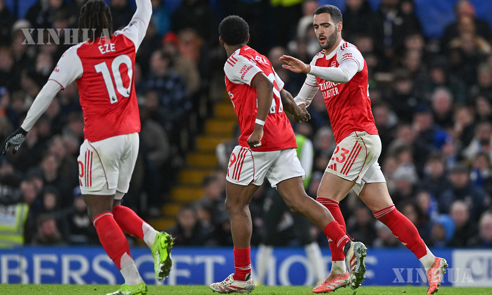 Mikel Merino of Arsenal celebrates scoring with teammates during the English Premier League match between Arsenal FC and Chelsea FC in London, Britain, on Nov. 30, 2025. (Xinhua)