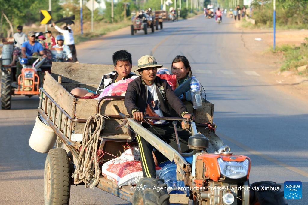 Cambodian civilians flee their homes near border with Thailand for a safe shelter in Siem Reap province, Cambodia on Dec. 8, 2025. (Agence Kampuchea Presse/Handout via Xinhua)