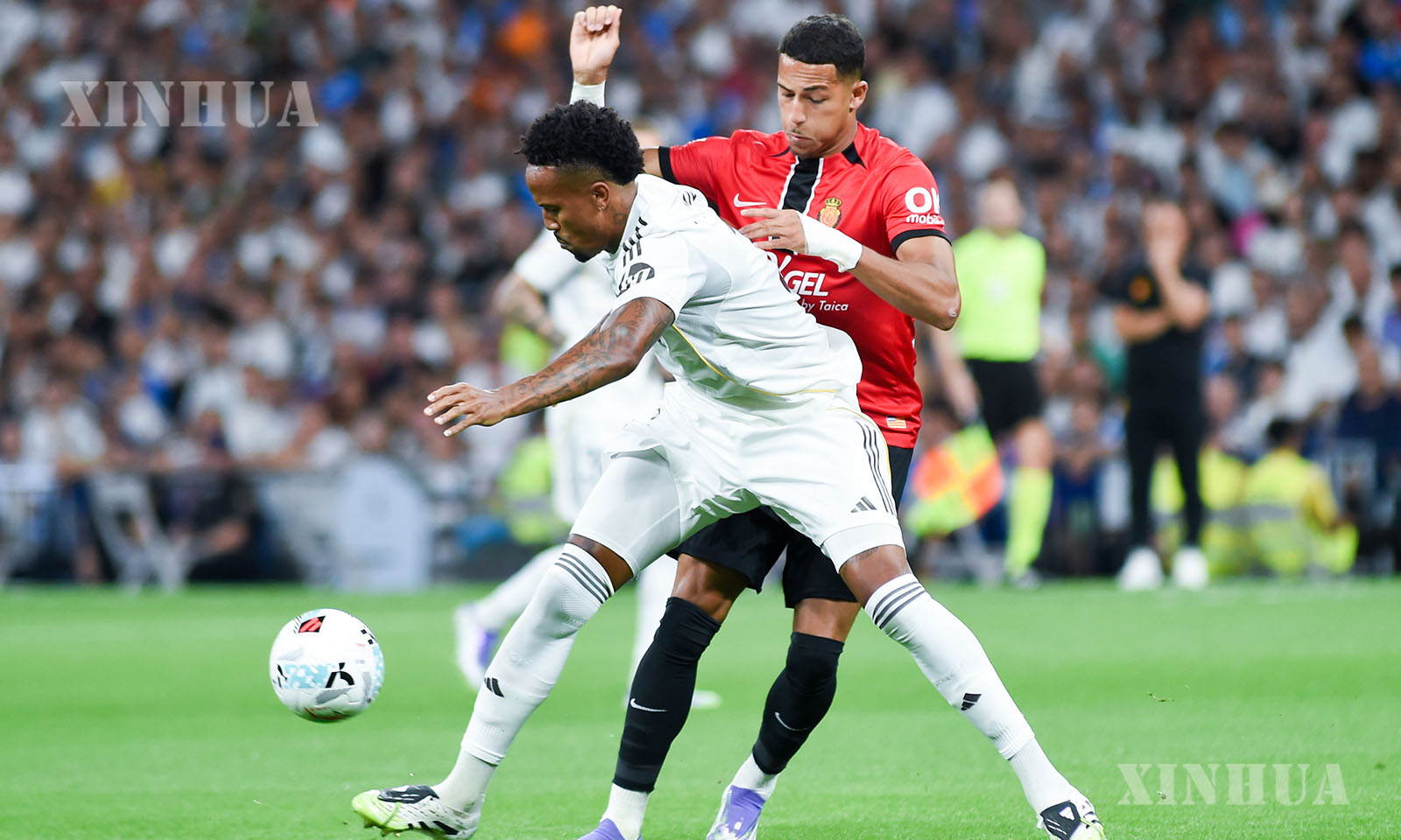 Eder Militao (front) of Real Madrid vies with Mateo Joseph of RCD Mallorca during the La Liga football match between Real Madrid and RCD Mallorca in Madrid, Spain, on Aug. 30, 2025. (Photo by Gustavo Valiente/Xinhua)