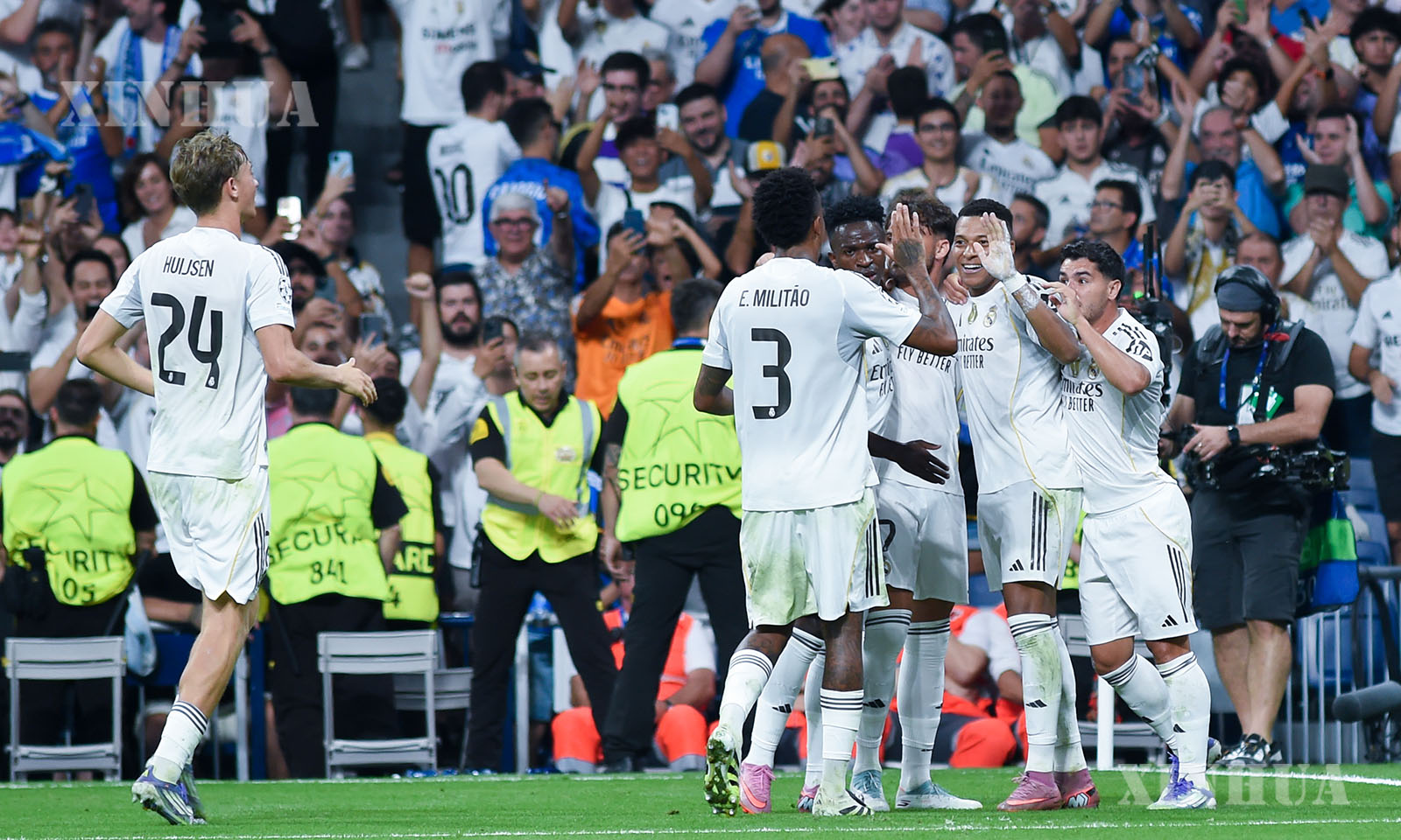 Eder Militao of Real Madrid celebrates a goal during the La Liga football match between Real Madrid and RCD Espanyol in Santiago Bernabeu Stadium, Madrid, Spain, Sept. 20, 2025. (Photo by Gustavo Valiente/Xinhua)