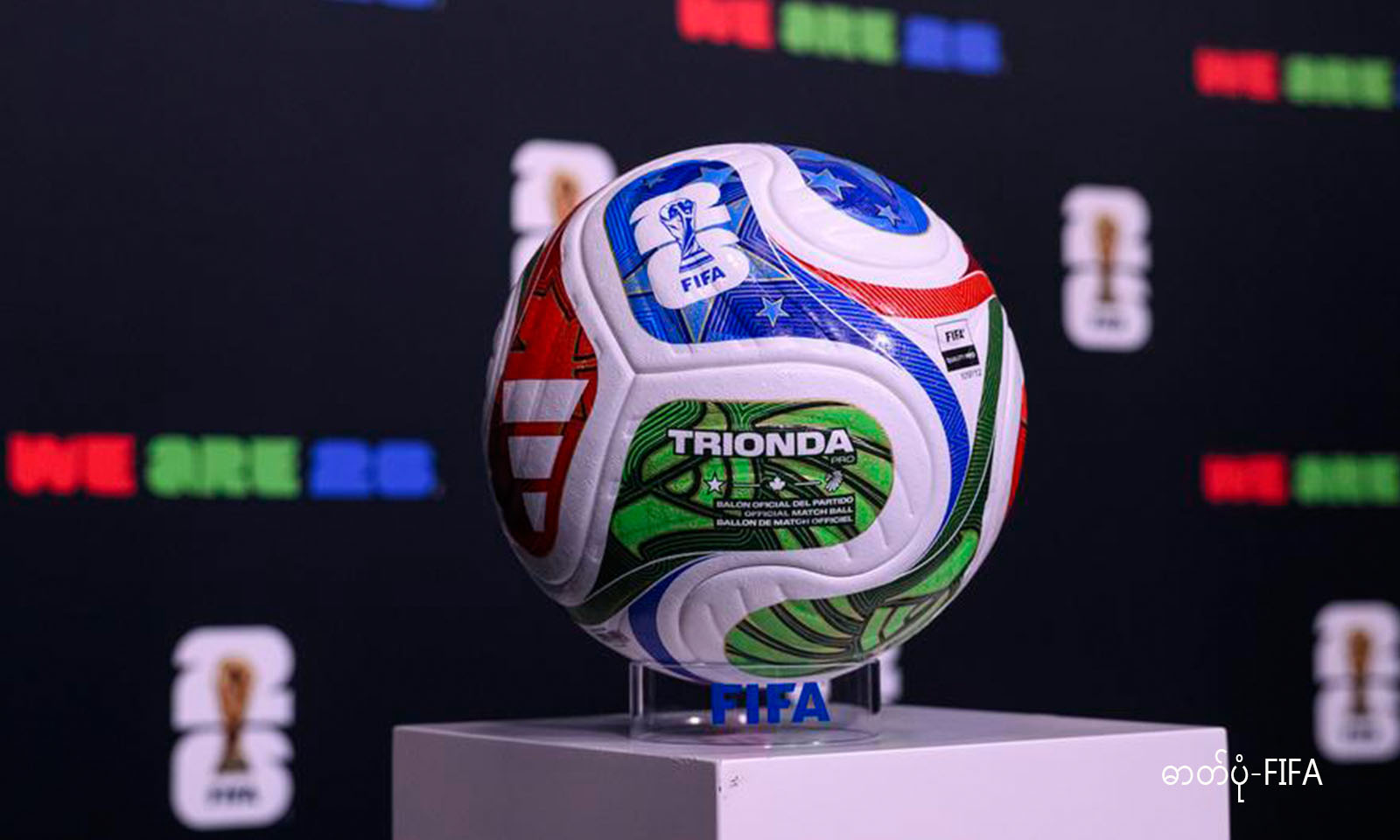 ၂၀၂၆ ခုနှစ် ဖီဖာကမ္ဘာ့ဖလားဘောလုံးပြိုင်ပွဲတွင် တရားဝင်အသုံးပြုမည့် ဘောလုံးဖြစ်သော”TRIONDA” အား တွေ့ရစဉ် (ဓာတ်ပုံ-FIFA)