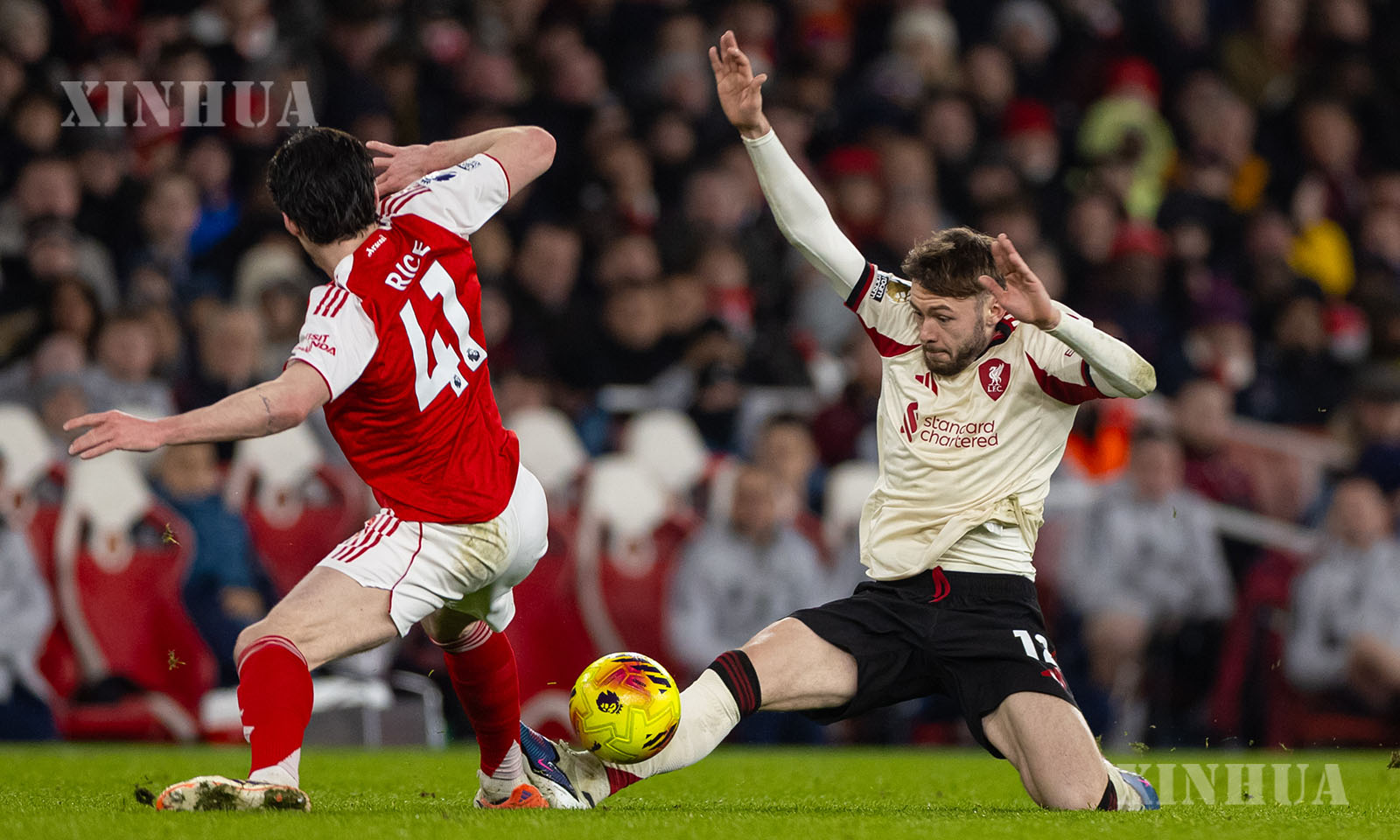 ဗြိတိန်နိုင်ငံ လန်ဒန်မြို့တွင် ၂၀၂၆ ခုနှစ် ဇန်နဝါရီ ၈ ရက်က အာဆင်နယ်နှင့် လီဗာပူးလ်အသင်းတို့ ယှဉ်ပြိုင်ကစားသည့် အင်္ဂလိပ်ပရီးမီးယားလိဂ်ပွဲစဉ်၌ လီဗာပူးလ်အသင်းမှ ကော်နာ ဘရက်ဒလေ (ယာ) နှင့် အာဆင်နယ်အသင်းမှ ဒက်ကလန် ရိုက်စ်တို့ ရင်ဆိုင်တွေ့နေစဉ် (ဆင်ဟွာ)