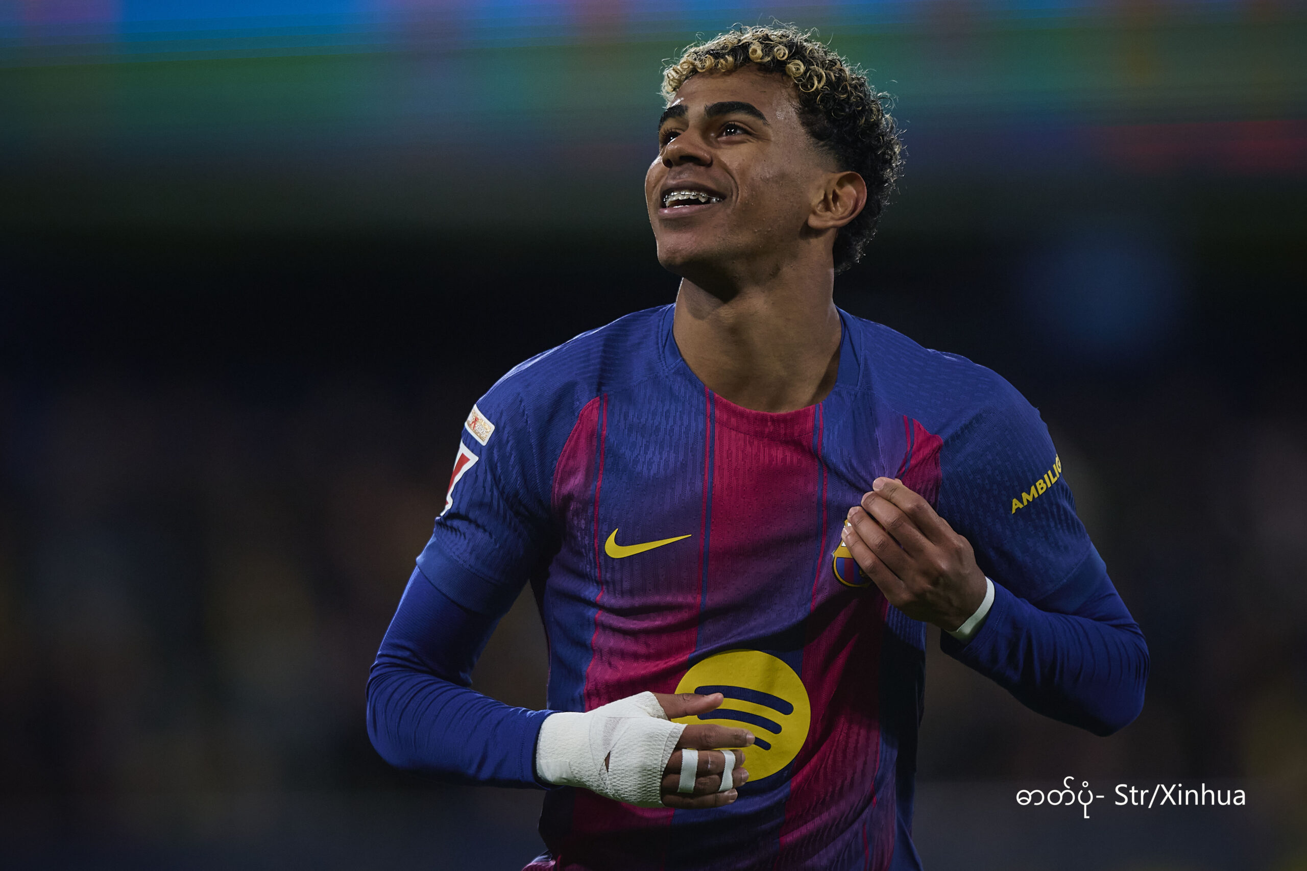စပိန်နိုင်ငံ ဗီလာရီးရဲလ်မြို့တွင် ၂၀၂၅ ခုနှစ် ဒီဇင်ဘာ ၂၁ ရက်က ဗီလာရီးရဲလ်နှင့် ဘာစီလိုနာအသင်းတို့ ယှဉ်ပြိုင်ကစားသည့် လာလီဂါဘောလုံးပွဲစဉ်၌ ဘာစီလိုနာအသင်းမှ လာမင်း ယမားလ် ဂိုးသွင်းပြီးနောက် အောင်ပွဲခံနေစဉ် (ဓာတ်ပုံ- Str/Xinhua)
