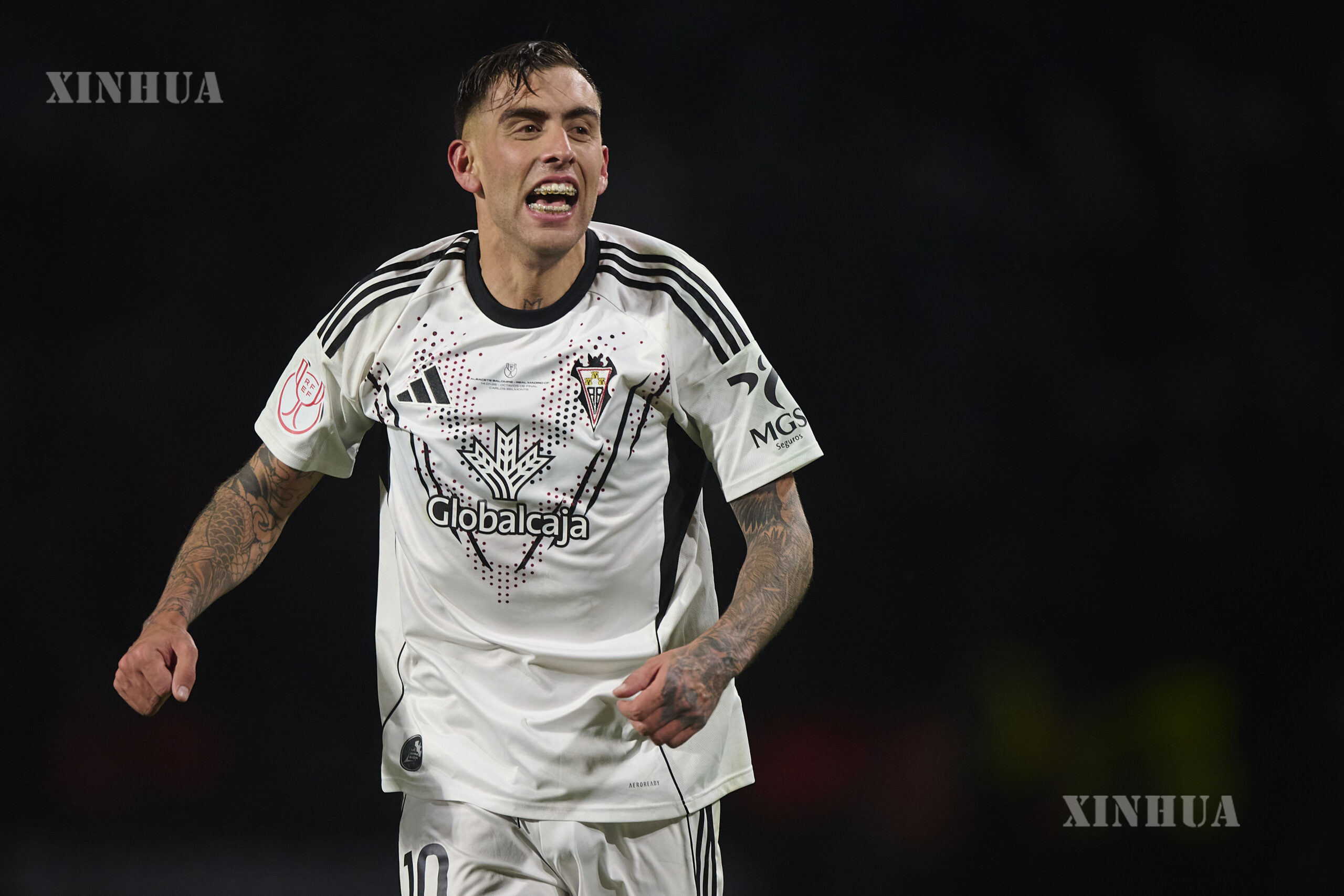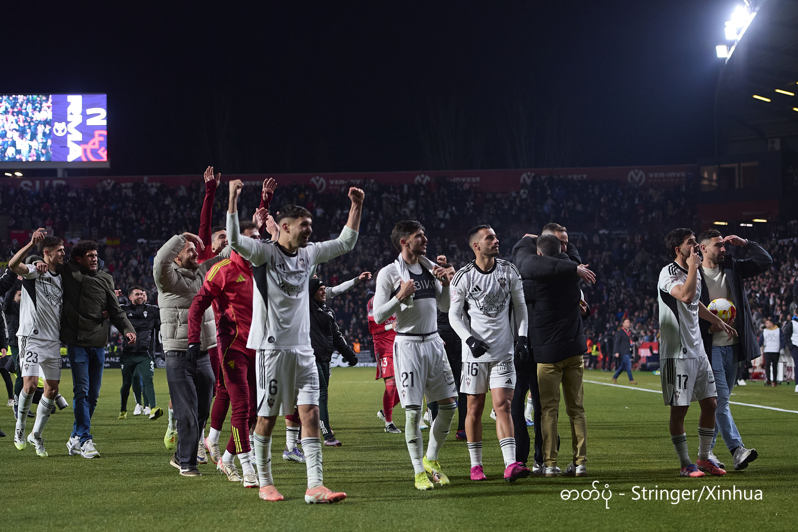 စပိန်နိုင်ငံ အယ်လ်ဘာစီတီမြို့တွင် ၂၀၂၆ ခုနှစ် ဇန်နဝါရီ ၁၄ ရက်က အယ်လ်ဘာစီတီအသင်းနှင့် ရီးရဲလ်မက်ဒရစ်အသင်းတို့ ယှဉ်ပြိုင်ကစားသည့် စပိန်ဘုရင့်ဖလား ၁၆ သင်းအဆင့် ဘောလုံးပွဲစဉ်အပြီးတွင် အနိုင်ရခဲ့သည့် အယ်လ်ဘာစီတီအသင်းသားများ အောင်ပွဲခံနေစဉ် (ဓာတ်ပုံ – Stringer/Xinhua)