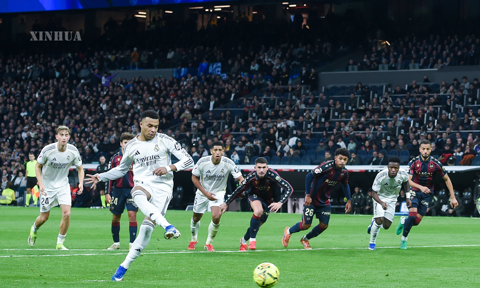စပိန်နိုင်ငံ မက်ဒရစ်မြို့တွင် ၂၀၂၆ ခုနှစ် ဇန်နဝါရီ ၁၇ ရက်က ရီးရဲလ်မက်ဒရစ်နှင့် လီဗန်တေးအသင်းတို့ ယှဉ်ပြိုင်ကစားခဲ့သည့် လာလီဂါဘောလုံးပွဲစဉ်၌ ရီးရဲလ်မက်ဒရစ်အသင်းမှ ကီလီယန် အမ်ဘာပေ (ရှေ့) ပင်နယ်တီကန်သွင်းနေစဉ် (ဆင်ဟွာ)