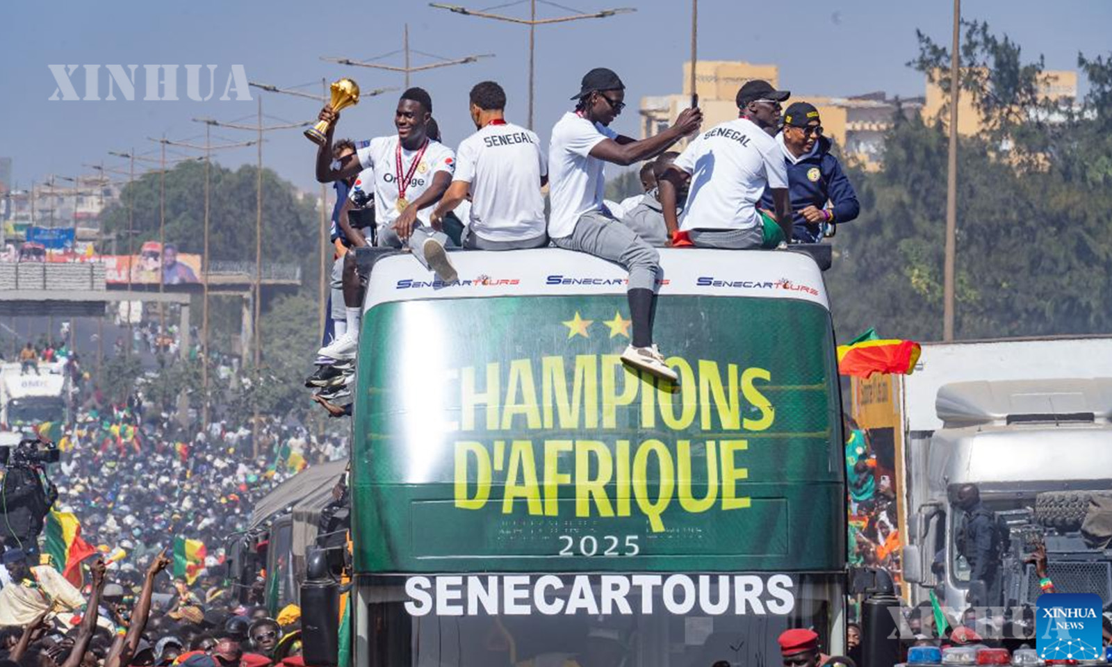 မော်ရိုကိုနိုင်ငံ မြို့တော်ရာဘတ်၌ ကျင်းပသည့် ၂၀၂၆ ခုနှစ် အာဖရိကနိုင်ငံများဖလားပြိုင်ပွဲ၌ “တီရန်ဂါ၏ ခြင်္သေ့များ” အမည်ရှိ ဆီနီဂေါဘောလုံးအသင်းက ချန်ပီယံဆုကို ဇန်နဝါရီ ၁၈ ရက်၌ ရရှိပြီးနောက် ဆီနီဂေါနိုင်ငံ မြို့တော်ဒတ်ကာ၏ လမ်းများတစ်လျှောက် ၎င်းတို့၏ အောင်ပွဲခံ စီတန်းလှည့်လည်ခဲ့ကြကြောင်း သိရသည်။ (Xinhua)