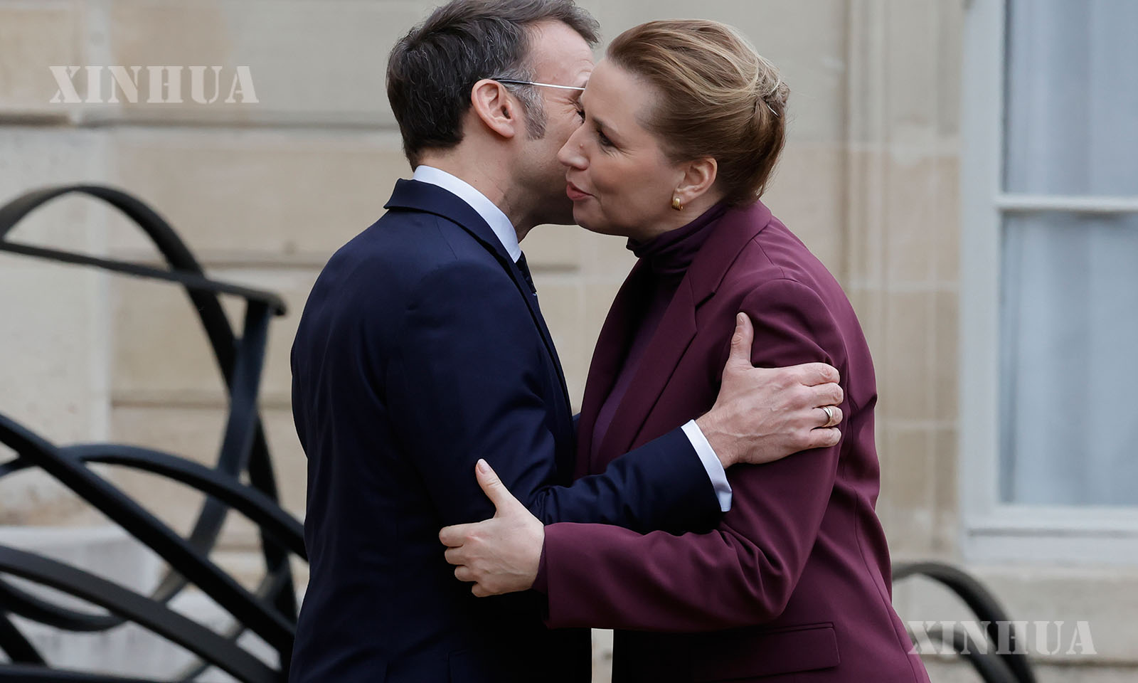 ပြင်သစ်သမ္မတ အီမန်နျူရယ် မက်ခရွန် (ဝဲ) က ဒိန်းမတ်ဝန်ကြီးချုပ် မက် ဖရက်ဒရစ်ဆင်အား ပြင်သစ်နိုင်ငံ ပဲရစ်မြို့ရှိ အီလီဇီးနန်းတော်၌ ၂၀၂၆ ခုနှစ် ဇန်နဝါရီ ၂၈ ရက်က ကြိုဆိုနေစဉ် (ဆင်ဟွာ)