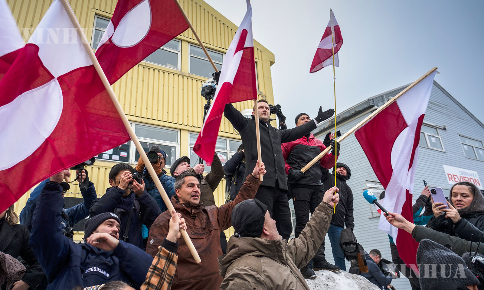 ဂရင်းလန်းကျွန်းအား ထိန်းချုပ်မည်ဟူသော အမေရိကန်၏ ပြောဆိုချက်များနှင့် လုပ်ရပ်များအပေါ် ဒိန်းမတ်နိုင်ငံ၏ ကိုယ်ပိုင်အုပ်ချုပ်ခွင့်ရနယ်မြေ ဂရင်းလန်းကျွန်း၏မြို့တော် နုခ်၌ ပြုလုပ်သည့် ဆန့်ကျင်ဆန္ဒပြမှုအတွင်း ဂရင်းလန်းဝန်ကြီးချုပ် ဂျန်စ်-ဖရီးဒရစ် နီရယ်လ်ဆင် (ဝဲ-ဆီးနှင်းပေါ်တွင် ရပ်နေသူ) အား ၂၀၂၆ ခုနှစ် ဇန်နဝါရီ ၁၇ ရက်က တွေ့ရစဉ် (ဆင်ဟွာ)