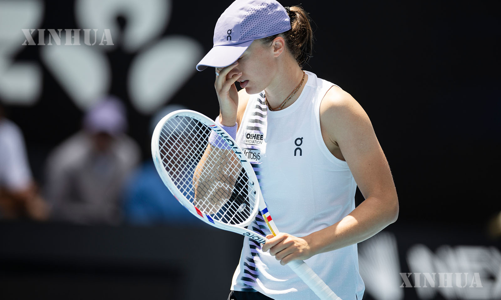 Iga Swiatek reacts during the women’s singles quarterfinal match between Elena Rybakina of Kazakhstan and Iga Swiatek of Poland at the Australian Open tennis tournament in Melbourne, Australia, Jan. 28, 2026. (Photo by Hu Jingchen/Xinhua)