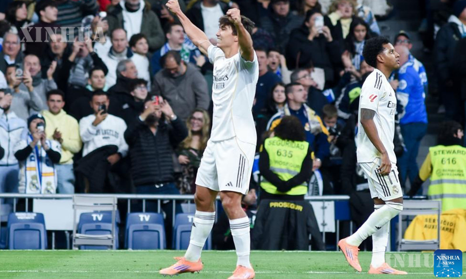 Real Madrid’s Gonzalo Garcia (L) celebrates after scoring during a La Liga football match between Real Madrid and Real Betis at Santiago Bernabeu stadium in Madrid, Spain, on Jan. 4, 2026. (Photo by Gustavo Valiente/Xinhua)