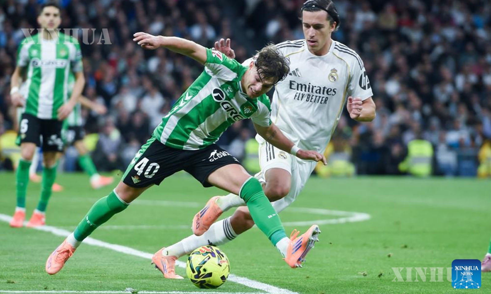 စပိန်နိုင်ငံ မက်ဒရစ်မြို့ရှိ ဆန်တီယာဂို ဘာနေဗျူးအားကစားကွင်းတွင် ၂၀၂၆ ခုနှစ် ဇန်နဝါရီ ၄ ရက်က ရီးရဲလ်မက်ဒရစ်နှင့် ရီးရဲလ်ဘက်တစ်အသင်းတို့ ယှဉ်ပြိုင်ကစားခဲ့သည့် လာလီဂါဘောလုံးပွဲစဉ်၌ ရီးရဲလ်မက်ဒရစ်အသင်းမှ အယ်လ်ဗာရို ကာရဲရက်စ် (ယာ) နှင့် ရီးရဲလ်ဘက်တစ်အသင်းမှ အိန်ဂျယ် အော်တိဇ်တို့ ရင်ဆိုင်တွေ့နေစဉ် (ဆင်ဟွာ)