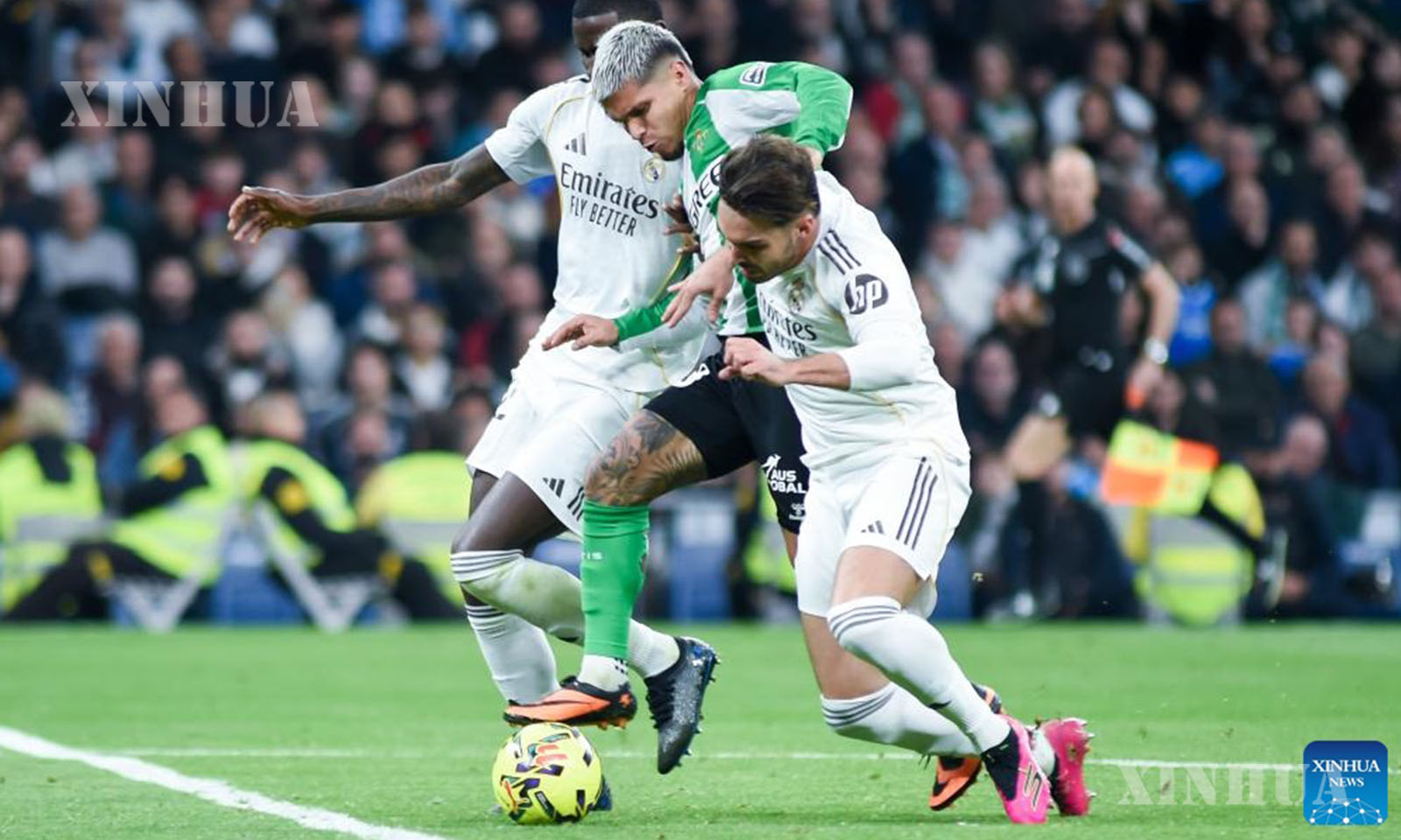 Real Madrid’s Alvaro Carreras (R) vies with Real Betis’ Angel Ortiz during a La Liga football match between Real Madrid and Real Betis at Santiago Bernabeu stadium in Madrid, Spain, on Jan. 4, 2026. (Photo by Gustavo Valiente/Xinhua)