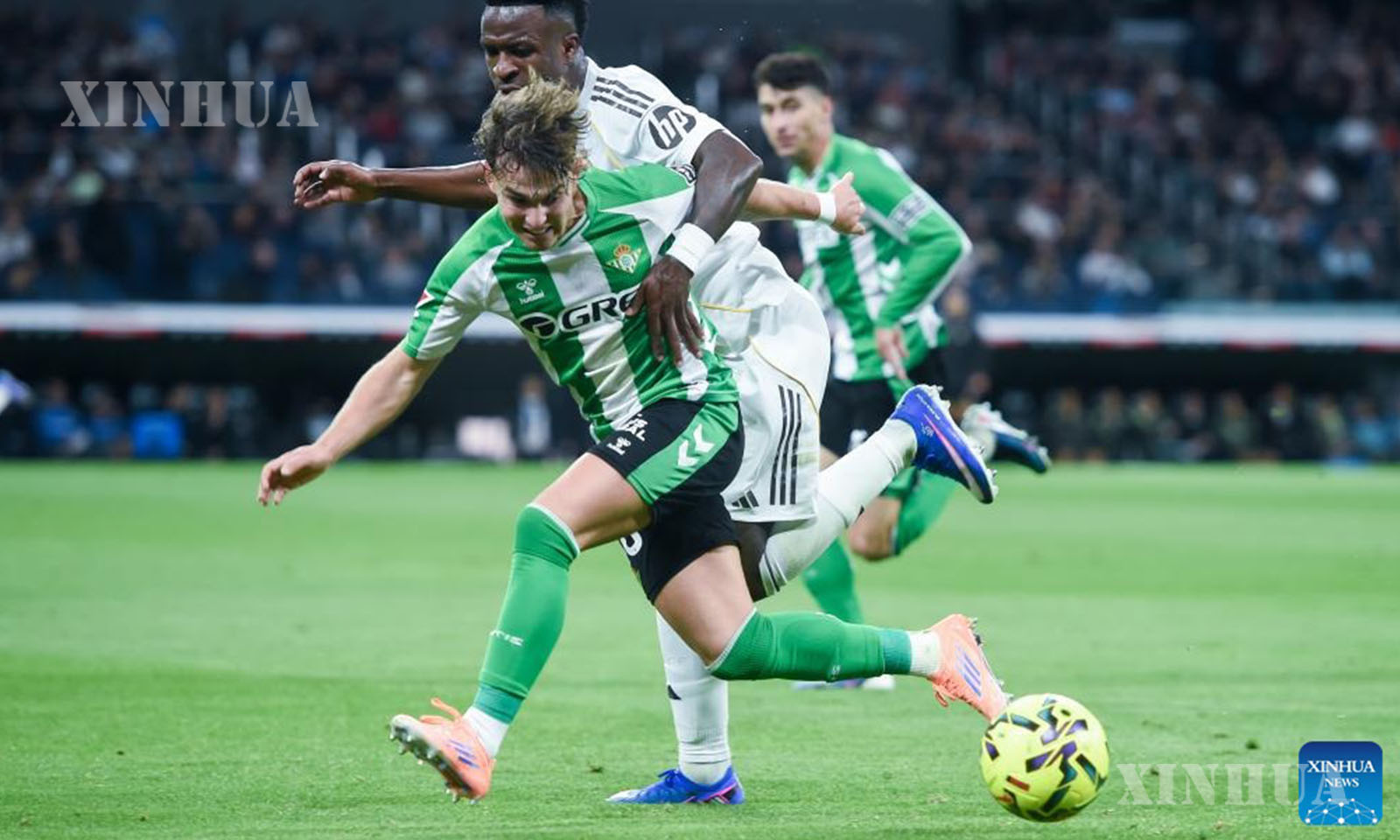 Real Madrid’s Vinicius Junior (L) vies with Real Betis’ Angel Ortiz during a La Liga football match between Real Madrid and Real Betis at Santiago Bernabeu stadium in Madrid, Spain, on Jan. 4, 2026. (Photo by Gustavo Valiente/Xinhua)