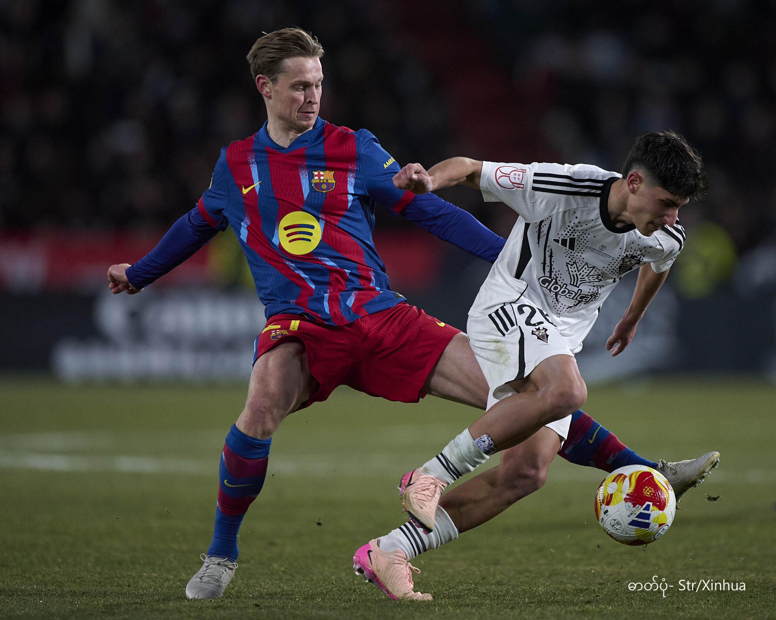 စပိန်နိုင်ငံ အယ်လ်ဘာစီတီမြို့တွင် ၂၀၂၆ ခုနှစ် ဖေဖော်ဝါရီ ၃ ရက်က အယ်လ်ဘာစီတီအသင်းနှင့် ဘာစီလိုနာအသင်းတို့ ယှဉ်ပြိုင်ကစားသည့် စပိန်ဘုရင့်ဖလား ကွာတားဖိုင်နယ်ပွဲစဉ်၌ ဘာစီလိုနာအသင်းမှ ဖရန်ကီ ဒီဂျောင် (ဝဲ) နှင့် အယ်လ်ဘာစီတီအသင်းမှ ကာပီတို့၏ ယှဉ်ပြိုင်ကစားဟန်ကို တွေ့ရစဉ် (ဓာတ်ပုံ- Str/Xinhua)