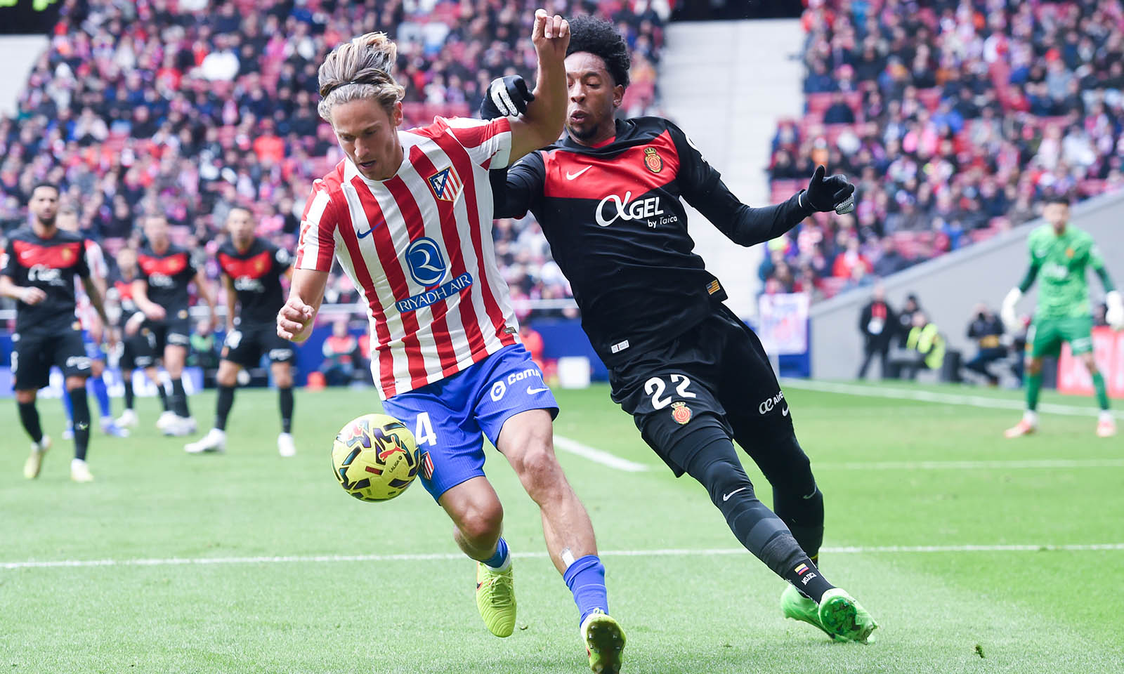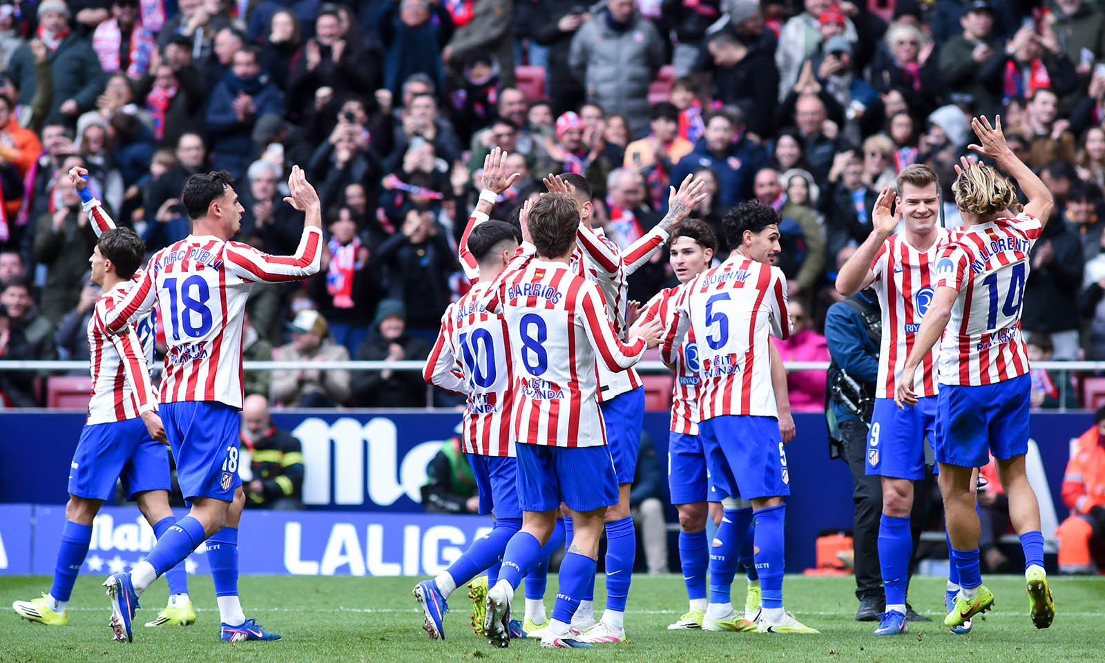 စပိန်နိုင်ငံ မက်ဒရစ်မြို့တွင် ၂၀၂၆ ခုနှစ် ဇန်နဝါရီ ၂၅ ရက်က အက်သလက်တီကို မက်ဒရစ်အသင်းနှင့် မာယော့ကာအသင်းတို့ ယှဉ်ပြိုင်ကစားသည့် လာလီဂါဘောလုံးပွဲစဉ်၌ အက်သလက်တီကို မက်ဒရစ် ကစားသမားများ ဂိုးသွင်းပြီးနောက် အောင်ပွဲခံနေစဉ် (ဓာတ်ပုံ- Str/Xinhua)