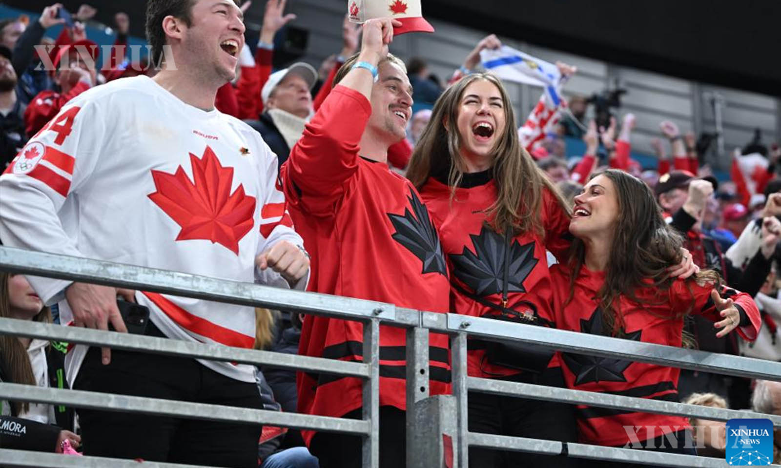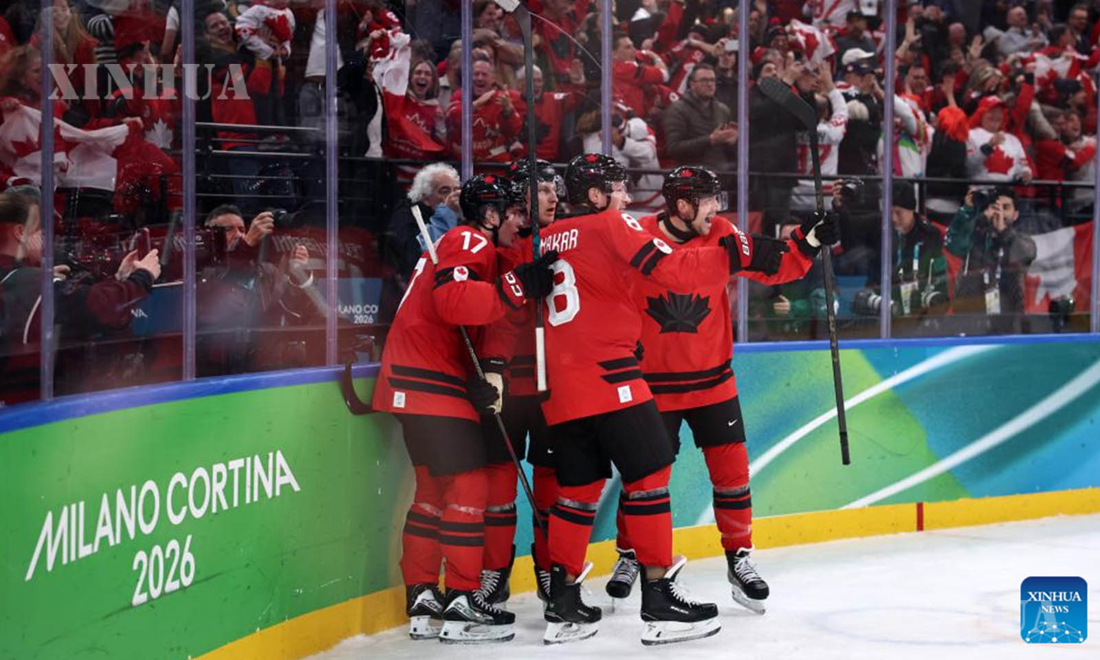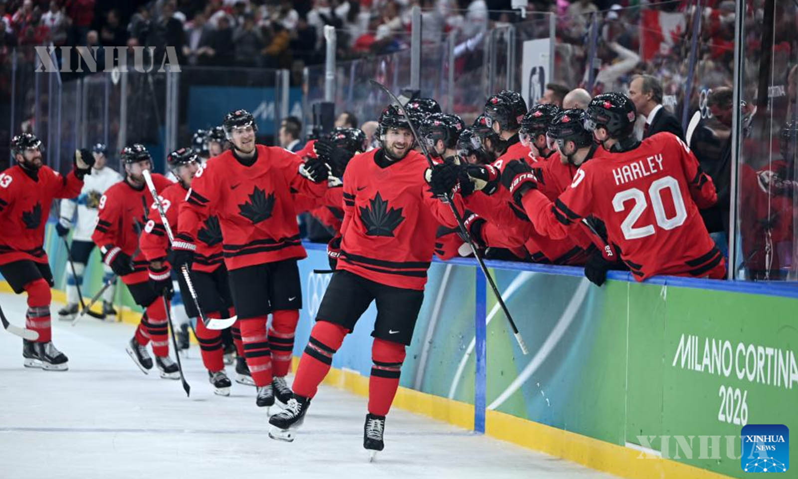 အီတလီနိုင်ငံ မီလန်မြို့၌ ဖေဖော်ဝါရီ ၂၀ ရက်က ကျင်းပသည့် ၂၀၂၆ ခုနှစ် မီလန်-ကော်တီနာ အိုလံပစ် ဆောင်းရာသီအားကစားပြိုင်ပွဲတွင် ကနေဒါအသင်းနှင့် ဖင်လန်အသင်းတို့၏ အမျိုးသား ရေခဲပြင်ဟော်ကီ play-offs ဆီမီးဖိုင်နယ်ပွဲစဉ်အတွင်း ဂိုးရရှိမှုအား အောင်ပွဲခံနေသည့် ကနေဒါအသင်းသားများကို ၂၀၂၆ ခုနှစ် ဖေဖော်ဝါရီ ၂၀ ရက်က တွေ့ရစဉ် (ဆင်ဟွာ)