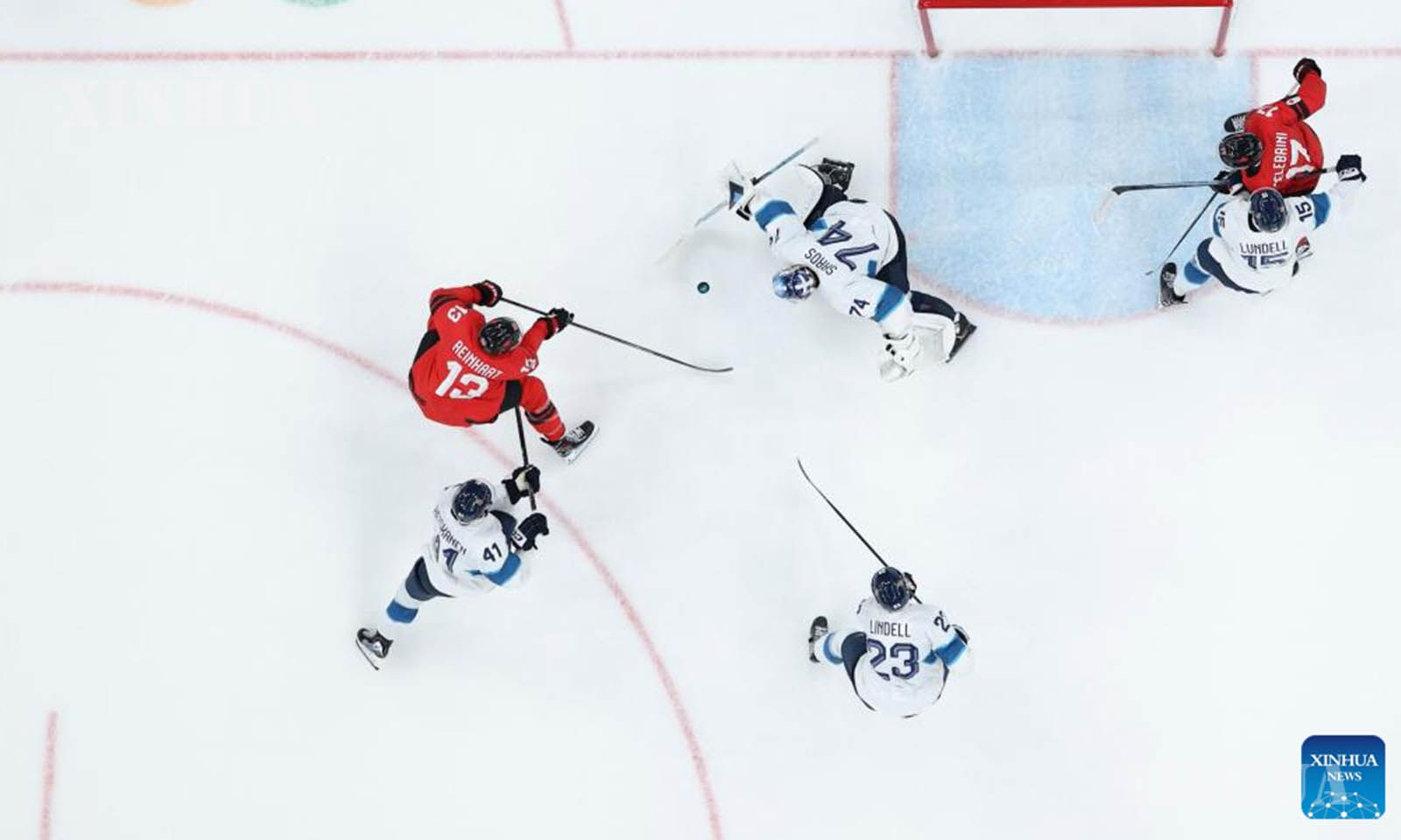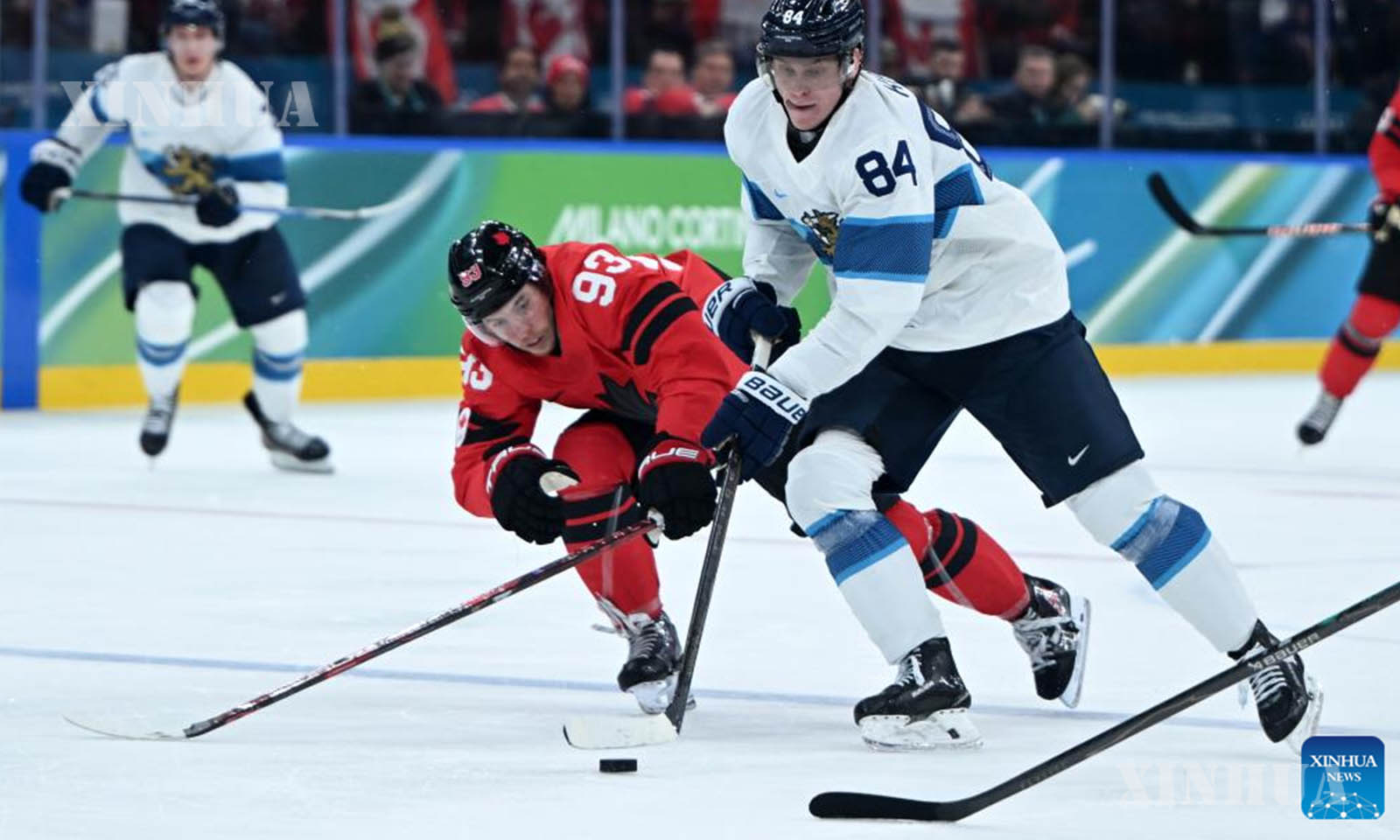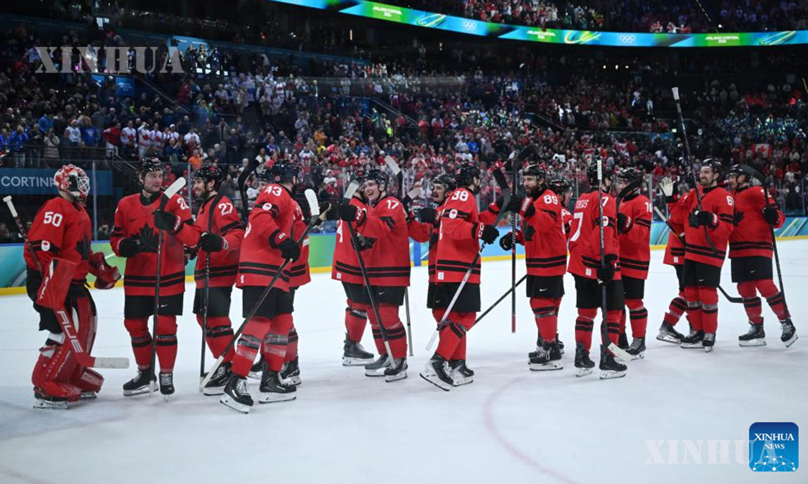 အီတလီနိုင်ငံ မီလန်မြို့၌ ဖေဖော်ဝါရီ ၂၀ ရက်က ကျင်းပသည့် ၂၀၂၆ ခုနှစ် မီလန်-ကော်တီနာ အိုလံပစ် ဆောင်းရာသီအားကစားပြိုင်ပွဲတွင် ကနေဒါအသင်းနှင့် ဖင်လန်အသင်းတို့၏ အမျိုးသား ရေခဲပြင်ဟော်ကီ play-offs ဆီမီးဖိုင်နယ်ပွဲစဉ်အတွင်း ဂိုးရရှိမှုအား အောင်ပွဲခံနေသည့် ကနေဒါအသင်းသားများကို ၂၀၂၆ ခုနှစ် ဖေဖော်ဝါရီ ၂၀ ရက်က တွေ့ရစဉ် (ဆင်ဟွာ)