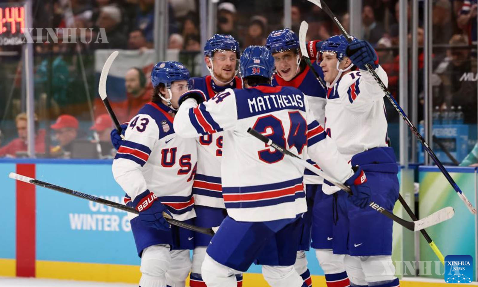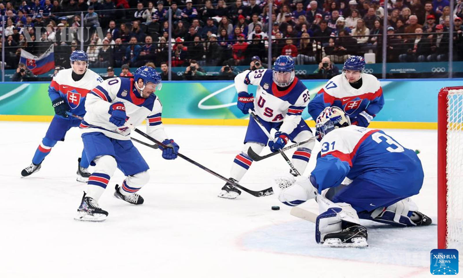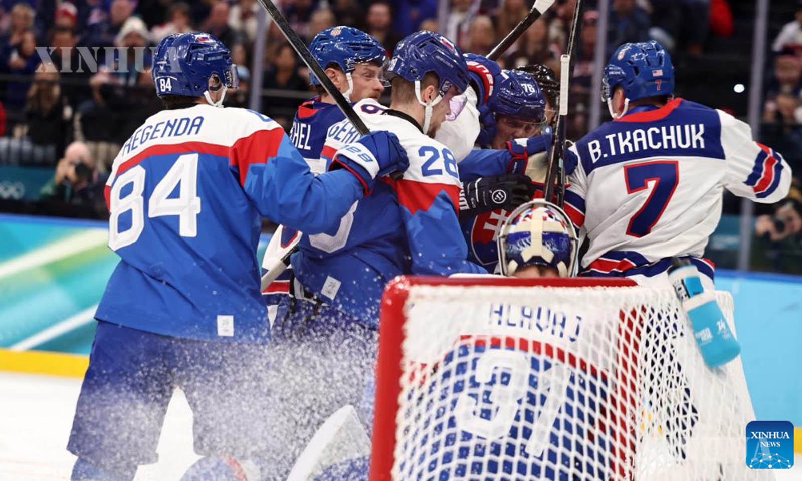 အီတလီနိုင်ငံ မီလန်မြို့၌ ဖေဖော်ဝါရီ ၂၀ ရက်က ကျင်းပသည့် ၂၀၂၆ ခုနှစ် မီလန်-ကော်တီနာ အိုလံပစ် ဆောင်းရာသီအားကစားပြိုင်ပွဲတွင် အမေရိကန်အသင်းနှင့် ဆလိုဗက်ကီးယားအသင်းတို့၏ အမျိုးသား ရေခဲပြင်ဟော်ကီ play-offs ဆီမီးဖိုင်နယ်ပွဲစဉ်အတွင်း ဂိုးရရှိမှုအတွက် အောင်ပွဲခံနေသည့် အမေရိကန်အသင်းသားများကို ၂၀၂၆ ခုနှစ် ဖေဖော်ဝါရီ ၂၀ ရက်က တွေ့ရစဉ် (ဆင်ဟွာ)
