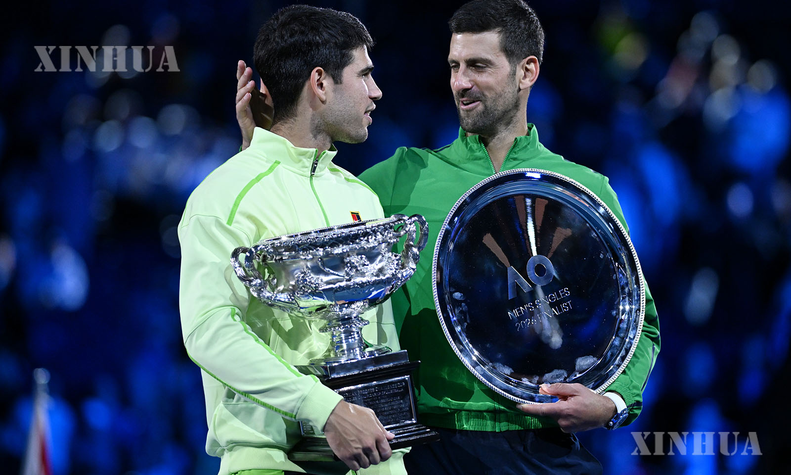 Carlos Alcaraz celebrates with the trophy at the awarding ceremony after winning the men’s singles final between Carlos Alcaraz of Spain and Novak Djokovic of Serbia at the Australian Open tennis tournament in Melbourne, Australia, Feb. 1, 2026. (Photo by Hu Jingchen/Xinhua)