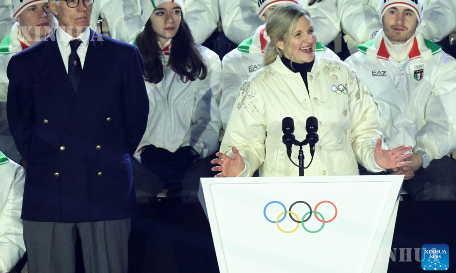 အီတလီနိုင်ငံ ဗီရိုနာမြို့ရှိ ဗီရိုနာ အိုလံပစ် အားကစားကွင်း၌ ကျင်းပသည့် ၂၀၂၆ ခုနှစ် မီလန်-ကော်တီနာ ဆောင်းရာသီ အိုလံပစ်အားကစားပြိုင်ပွဲ ပိတ်ပွဲအခမ်းအနားတွင် အမှာစကားပြောကြားနေသည့် နိုင်ငံတကာ အိုလံပစ်ကော်မတီ (IOC) ဥက္ကဋ္ဌ Kirsty Coventry ကို ၂၀၂၆ ခုနှစ် ဖေဖော်ဝါရီ ၂၂ ရက်က တွေ့ရစဉ် (ဆင်ဟွာ)
