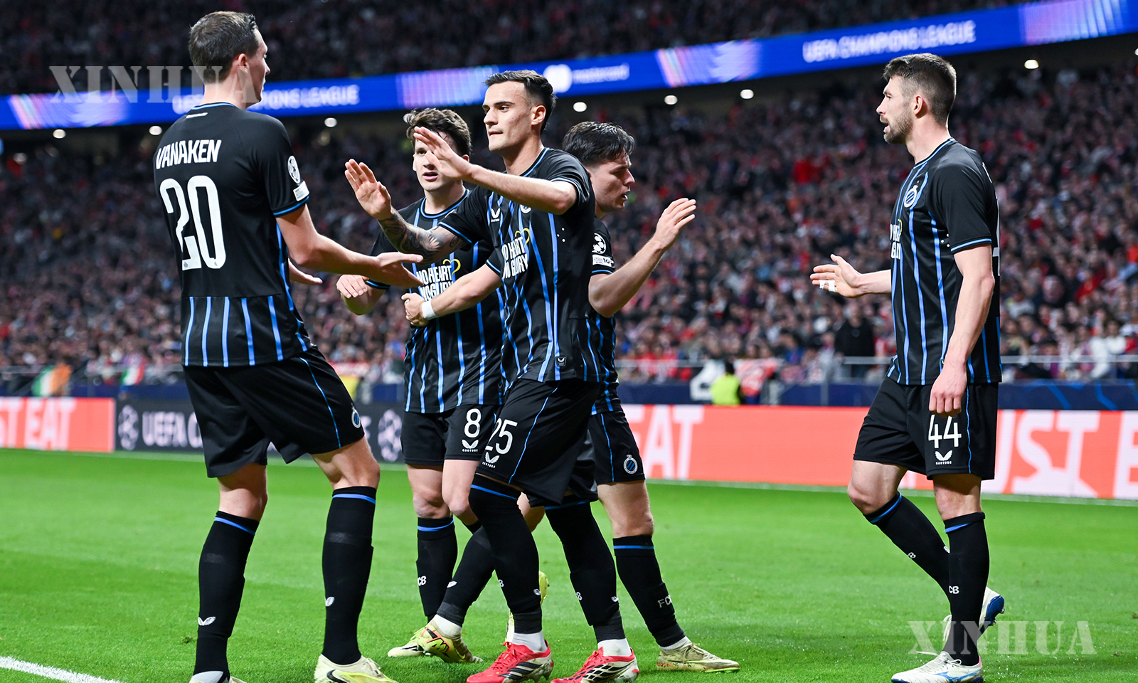 စပိန်နိုင်ငံ မက်ဒရစ်မြို့တွင် ၂၀၂၆ ခုနှစ် ဖေဖော်ဝါရီ ၂၄ ရက်က အက်သလက်တီကို မက်ဒရစ်အသင်းနှင့် ကလပ်ဘရုဂေးအသင်းတို့ ယှဉ်ပြိုင်ကစားသည့် ယူအီးအက်ဖ်အေ ချန်ပီယံလိဂ် ရှုံးထွက် play-off ဒုတိယအကျော့ပွဲစဉ်၌ ကလပ်ဘရုဂေးအသင်းမှ ကစားသမားများ ဂိုးသွင်းပြီးနောက် အောင်ပွဲခံနေစဉ် (ဆင်ဟွာ)