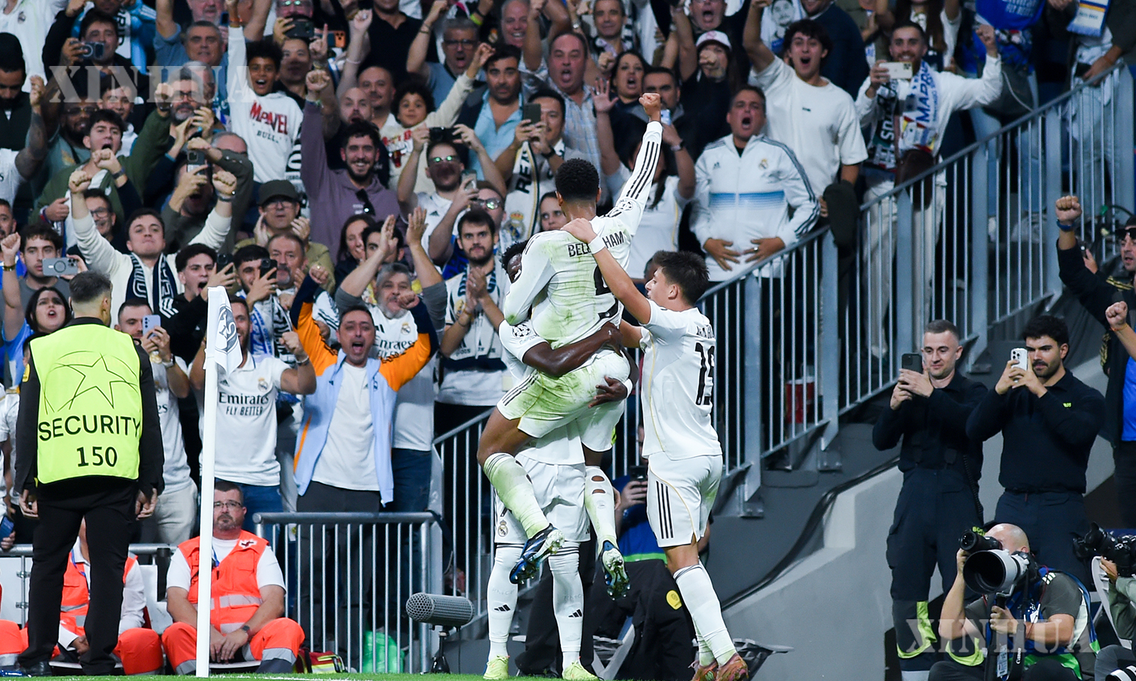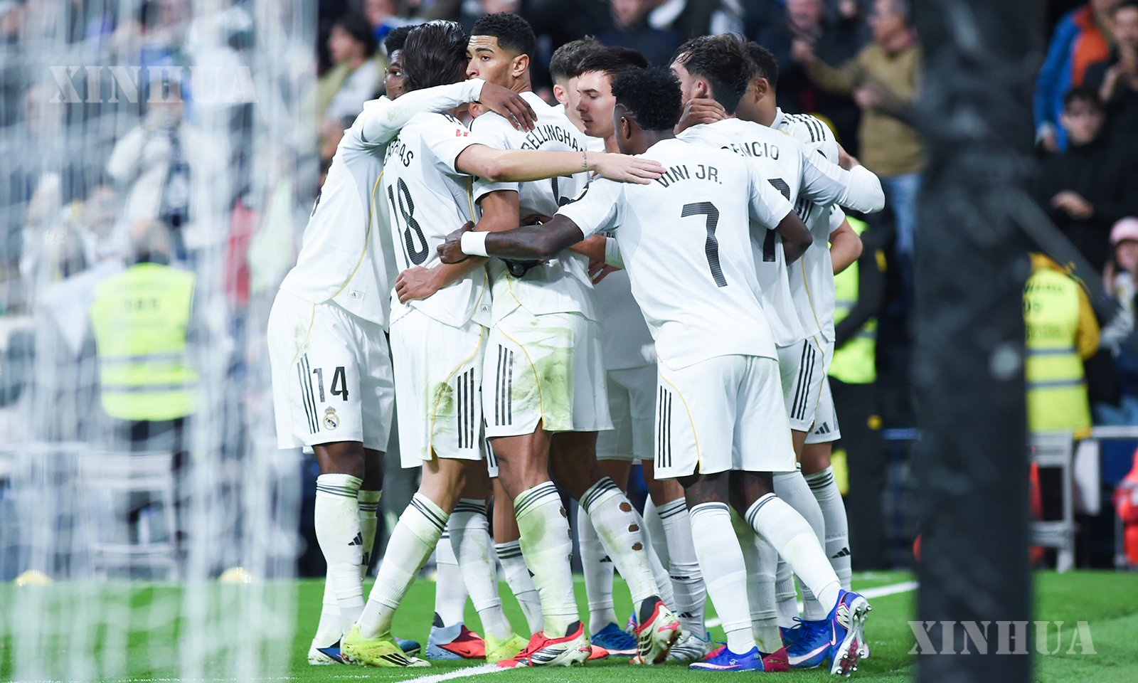 စပိန်နိုင်ငံ မက်ဒရစ်မြို့ရှိ ဆန်တီယာဂို ဘာနေဗျူး အားကစားကွင်း၌ ၂၀၂၅ ခုနှစ် အောက်တိုဘာ ၂၂ ရက်က ရီးရဲလ်မက်ဒရစ်အသင်းနှင့် ဂျူဗင်တပ်စ်အသင်းတို့ ယှဉ်ပြိုင်ကစားသည့် ယူအီးအက်ဖ်အေ ချန်ပီယံလိဂ်ပွဲစဉ်၌ ရီးရဲလ်မက်ဒရစ် ကစားသမားများ ဂိုးသွင်းပြီးနောက် အောင်ပွဲခံနေစဉ် (ဆင်ဟွာ)