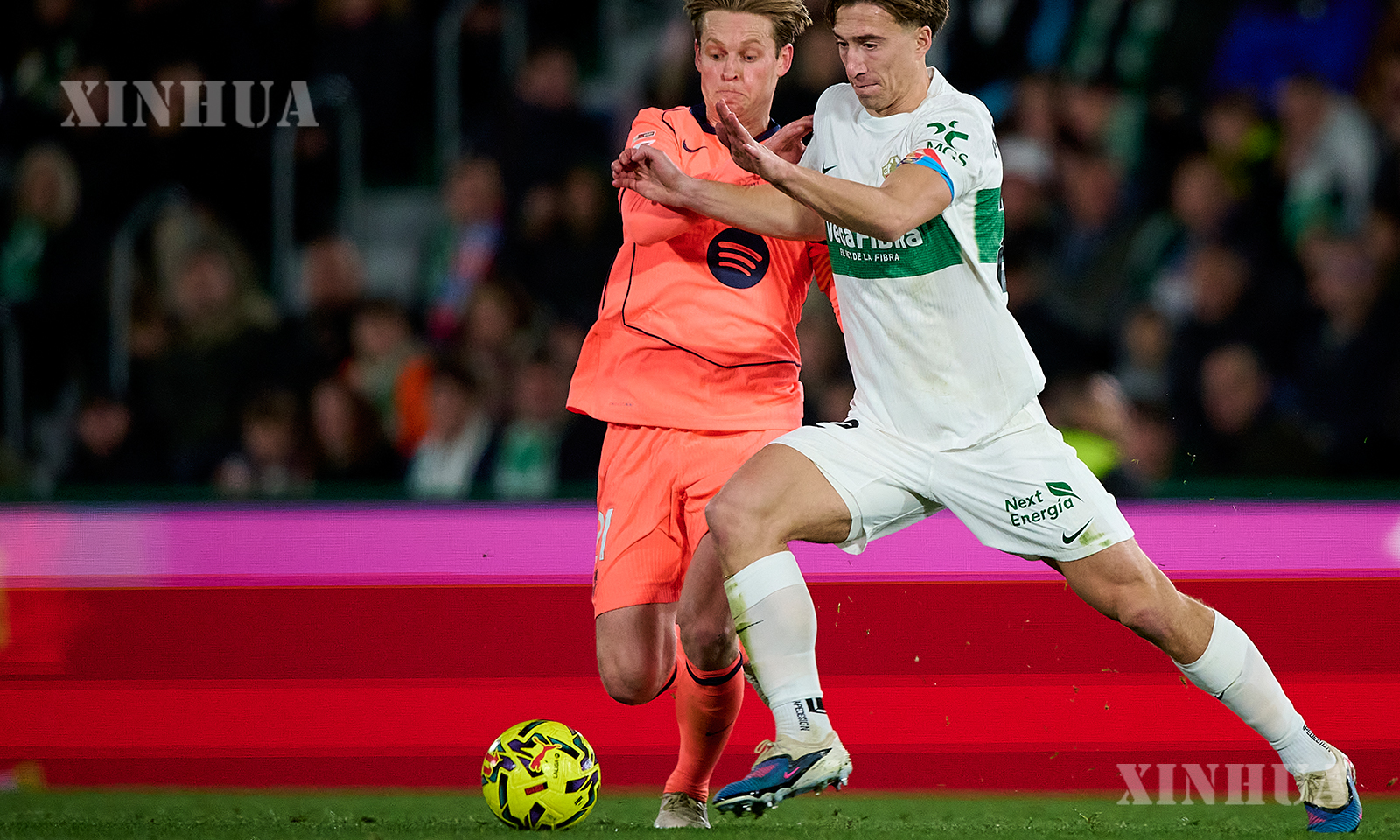စပိန်နိုင်ငံ အယ်လ်ချီမြို့တွင် ၂၀၂၆ ခုနှစ် ဇန်နဝါရီ ၃၁ ရက်က အယ်လ်ချီအသင်းနှင့် ဘာစီလိုနာအသင်းတို့ ယှဉ်ပြိုင်ကစားသည့် လာလီဂါဘောလုံးပွဲစဉ်၌ ဘာစီလိုနာအသင်းမှ ဖရန်ကီ ဒီဂျောင် (ဝဲ) နှင့် အယ်လ်ချီအသင်းမှ ဒေးဗစ် အက်ဖန်ဂရူဘာတို့ ယှဉ်ပြိုင်ကစားနေပုံကို တွေ့ရစဉ် (ဆင်ဟွာ)