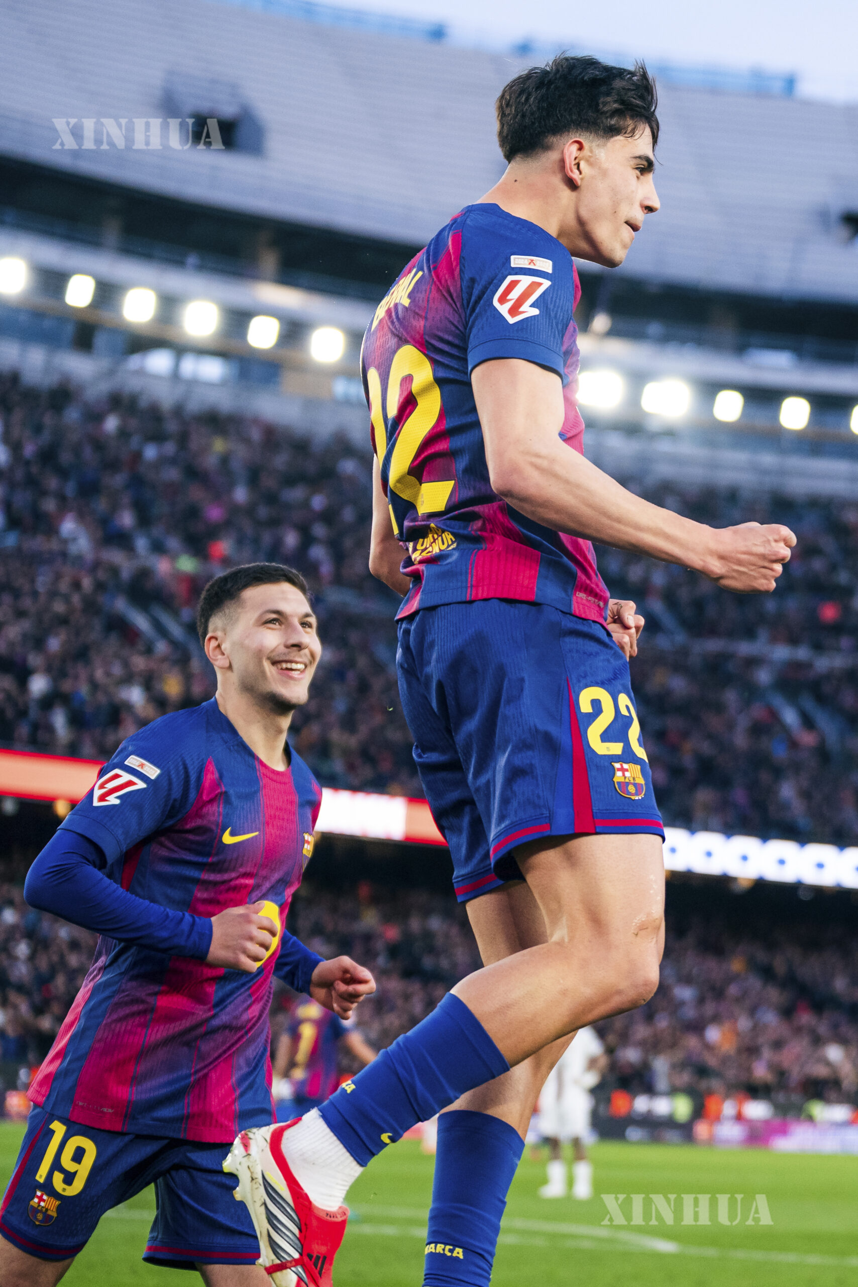 Marc Bernal (R) of Barcelona celebrates his score during La Liga football match between FC Barcelona and RCD Mallorca in Barcelona, Spain, Feb. 7, 2026. (Photo by Joan Gosa/Xinhua)