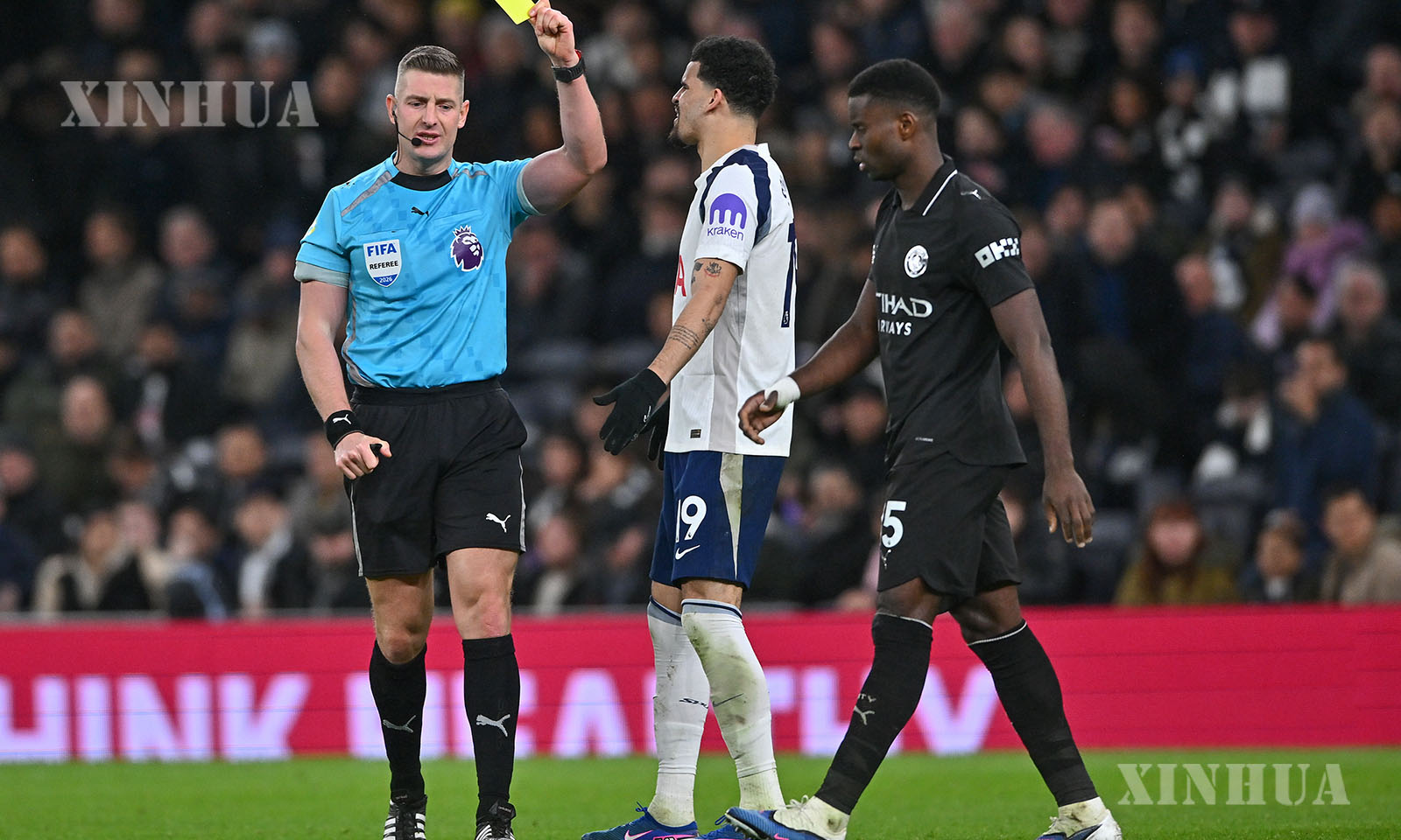 Dominic Solanke (C) of Tottenham Hotspur is shown the yellow card during the English Premier League match between Tottenham Hotspur and Manchester City in London, Britain, on Feb. 1, 2026. (Xinhua)