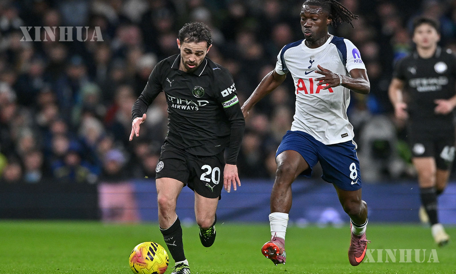 Bernardo Silva (L) of Manchester City vies with Yves Bissouma of Tottenham Hotspur during the English Premier League match between Tottenham Hotspur and Manchester City in London, Britain, on Feb. 1, 2026. (Xinhua)