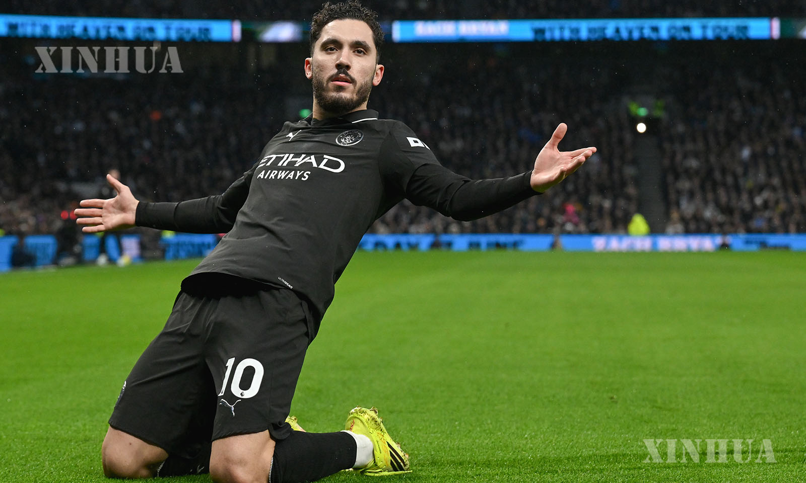 Antoine Semenyo (L) of Manchester City celebrates after scoring with teammate Erling Haaland during the English Premier League match between Tottenham Hotspur and Manchester City in London, Britain, on Feb. 1, 2026. (Xinhua)
