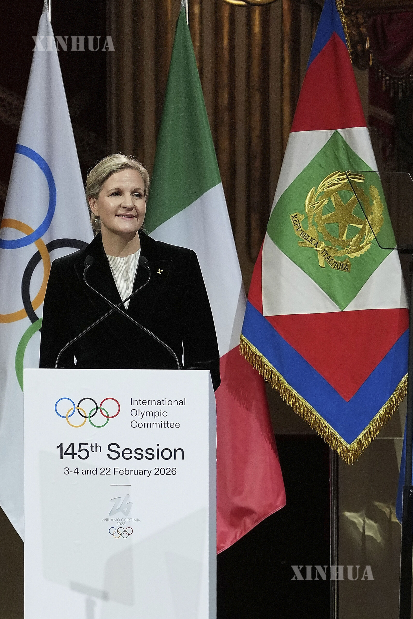 IOC President Kirsty Coventry delivers a speech during the opening ceremony of the 145th IOC Session at La Scala Theatre in Milan, Italy on Feb. 2, 2026. (Xinhua/Sun Fei)