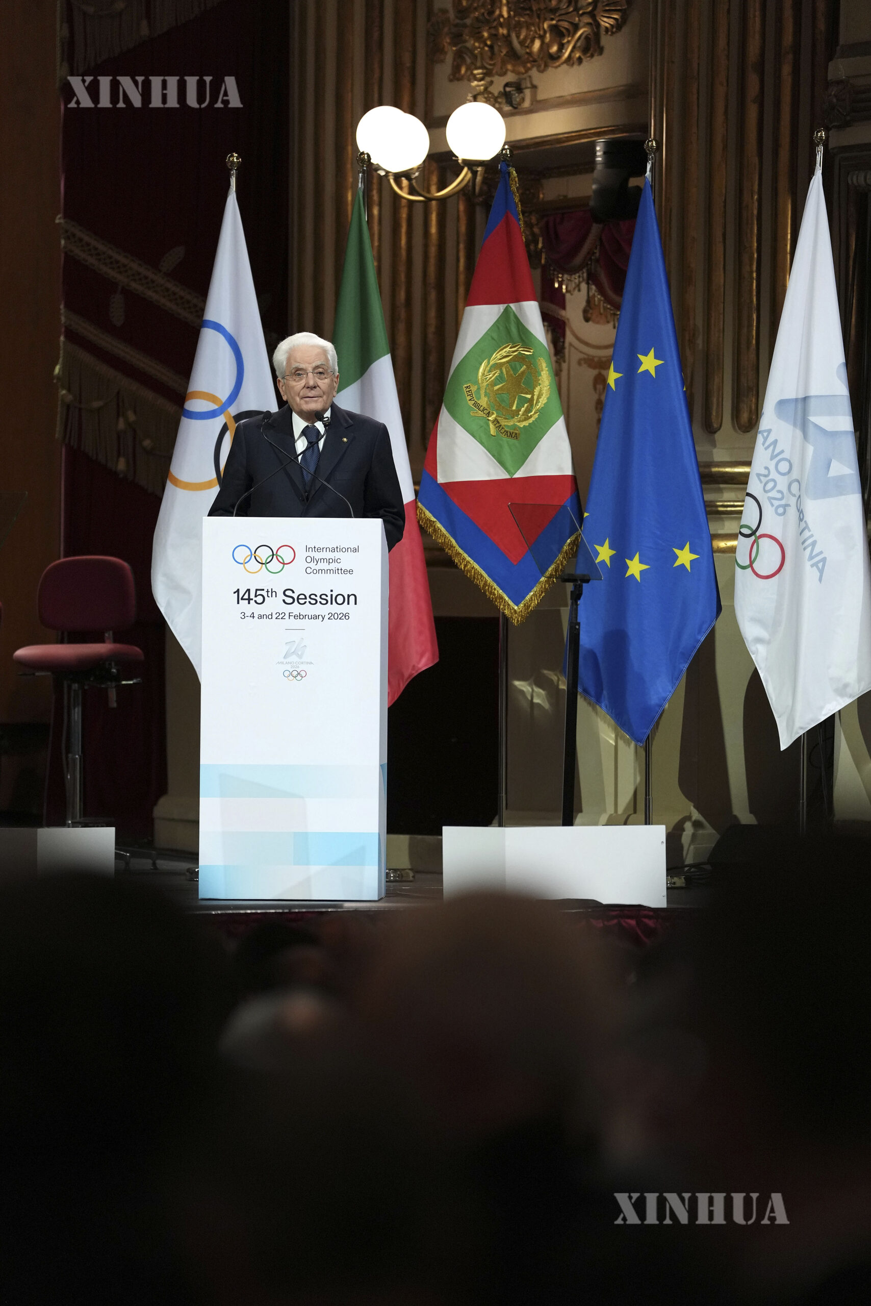 Italian President Sergio Mattarella delivers a speech during the opening ceremony of the 145th IOC Session at La Scala Theatre in Milan, Italy on Feb. 2, 2026. (Xinhua/Sun Fei)