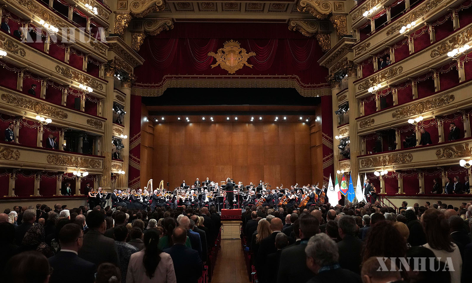 အီတလီနိုင်ငံ မီလန်မြို့ရှိ လာစကာလာပြဇာတ်ရုံ၌ ၂၀၂၆ ခုနှစ် ဖေဖော်ဝါရီ ၂ ရက်က ကျင်းပသည့် ၁၄၅ ကြိမ်မြောက် IOC အစည်းအဝေး ဖွင့်ပွဲအခမ်းအနား မြင်ကွင်းအား တွေ့ရစဉ် (ဆင်ဟွာ)