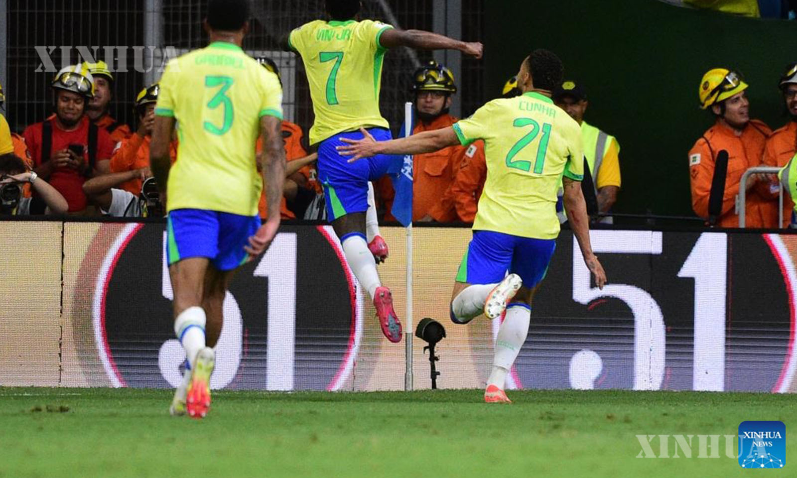ဘရာဇီးနိုင်ငံ ဘရာဇီးလီးယားမြို့တွင် ၂၀၂၅ ခုနှစ် မတ် ၂၀ ရက်က ဘရာဇီးအသင်းနှင့် ကိုလံဘီယာအသင်းတို့ ယှဉ်ပြိုင်ကစားသည့် ၂၀၂၆ ဖီဖာကမ္ဘာ့ဖလားပြိုင်ပွဲ တောင်အမေရိကဇုန် ခြေစစ်ပွဲ ဘောလုံးပွဲစဉ်၌ ဘရာဇီးအသင်းမှ ဗင်နီစီယက်စ် ဂျူနီယာ (အလယ်) ဂိုးသွင်းပြီးနောက် အောင်ပွဲခံနေစဉ် (ဆင်ဟွာ)
