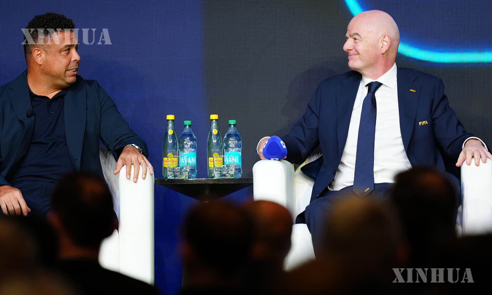 Brazilian former player Ronaldo Nazario and FIFA President Gianni Infantino converse during the unveiling of the match schedule for the FIFA World Cup 2026 in Washington, D.C., the United States, on Dec. 6, 2025. (Xinhua/Jia Haocheng)