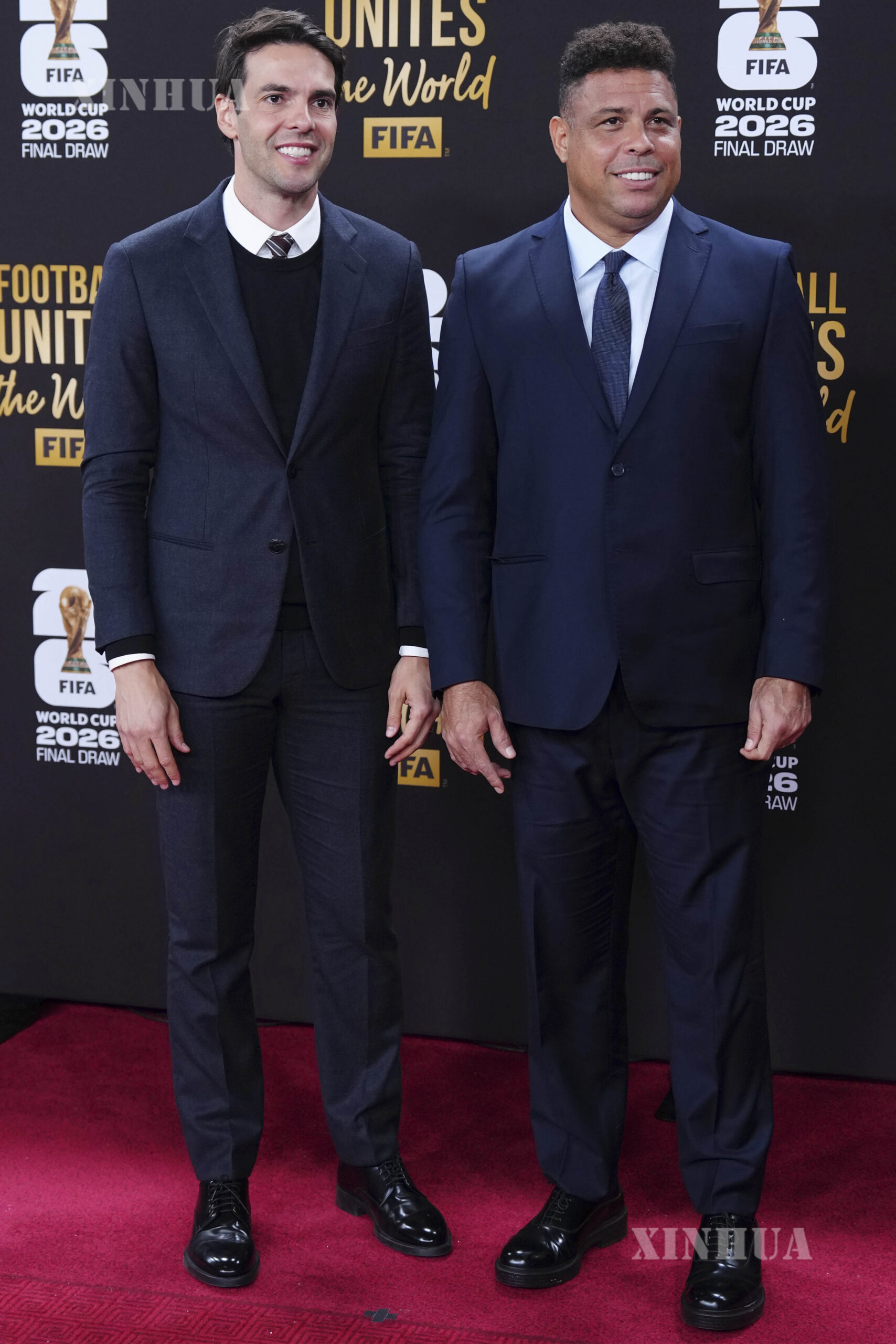အမေရိကန်နိုင်ငံ မြို့တော်ဝါရှင်တန်ရှိ ကနေဒီစင်တာ၌ ၂၀၂၆ ဖီဖာကမ္ဘာ့ဖလား ဘောလုံးပြိုင်ပွဲ မဲခွဲပွဲမတိုင်မီ ကော်ဇောနီပေါ်၌ အမှတ်တရဓာတ်ပုံရိုက်နေသည့် ဘရာဇီး ဘောလုံးသမားဟောင်းများဖြစ်သည့် ကာကာ (ဝဲ) နှင့် ရော်နယ်ဒို နာဇာရီယိုတို့အား ၂၀၂၅ ခုနှစ် ဒီဇင်ဘာ ၅ ရက်က တွေ့ရစဉ် (ဆင်ဟွာ)