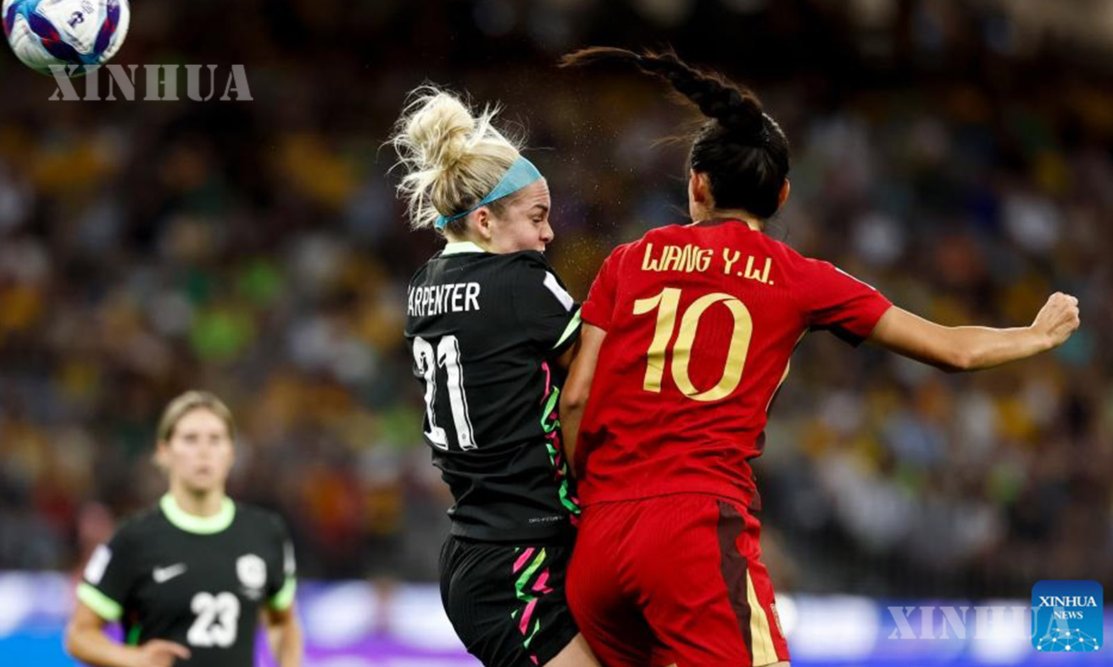 ဩစတြေးလျနိုင်ငံ ပါ့သ်မြို့ရှိ ပါ့သ်အားကစားကွင်း၌ ၂၀၂၆ ခုနှစ် မတ် ၁၇ ရက်က တရုတ်အသင်းနှင့် ဩစတြေးလျအသင်းတို့ ယှဉ်ပြိုင်ကစားသည့် အေအက်ဖ်စီ အာရှဖလား အမျိုးသမီးဘောလုံးပြိုင်ပွဲ ဆီမီးဖိုင်နယ်ပွဲစဉ်တွင် တရုတ်အသင်းမှ ဝမ်ယန်ဝန် (ယာ) နှင့် ဩစတြေးလျအသင်းမှ အယ်လီ ကာပင်တာတို့ ဘောလုံးယှဉ်လုနေစဉ် (ဆင်ဟွာ)