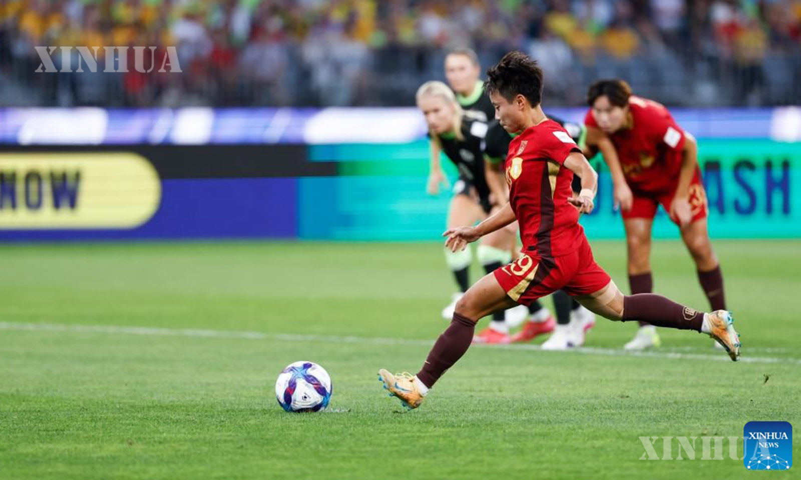 ဩစတြေးလျနိုင်ငံ ပါ့သ်မြို့ရှိ ပါ့သ်အားကစားကွင်း၌ ၂၀၂၆ ခုနှစ် မတ် ၁၇ ရက်က တရုတ်အသင်းနှင့် ဩစတြေးလျအသင်းတို့ ယှဉ်ပြိုင်ကစားသည့် အေအက်ဖ်စီ အာရှဖလား အမျိုးသမီးဘောလုံးပြိုင်ပွဲ ဆီမီးဖိုင်နယ်ပွဲစဉ်တွင် တရုတ်အသင်းမှ ကျန်းလျင်ယန့် ပင်နယ်တီမှတစ်ဆင့် ဂိုးသွင်းယူနေစဉ် (ဆင်ဟွာ)