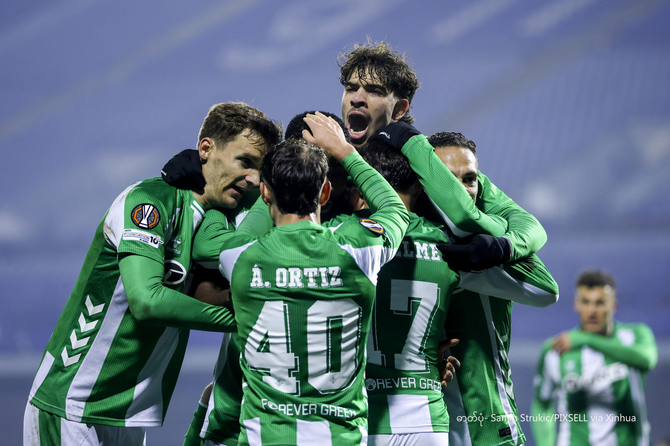Players of Real Betis celebrate team’s third goal during the UEFA Europa League 2025/26 League Phase match between GNK Dinamo and Real Betis in Zagreb, Croatia, on Dec. 11, 2025. (Sanjin Strukic/PIXSELL via Xinhua)