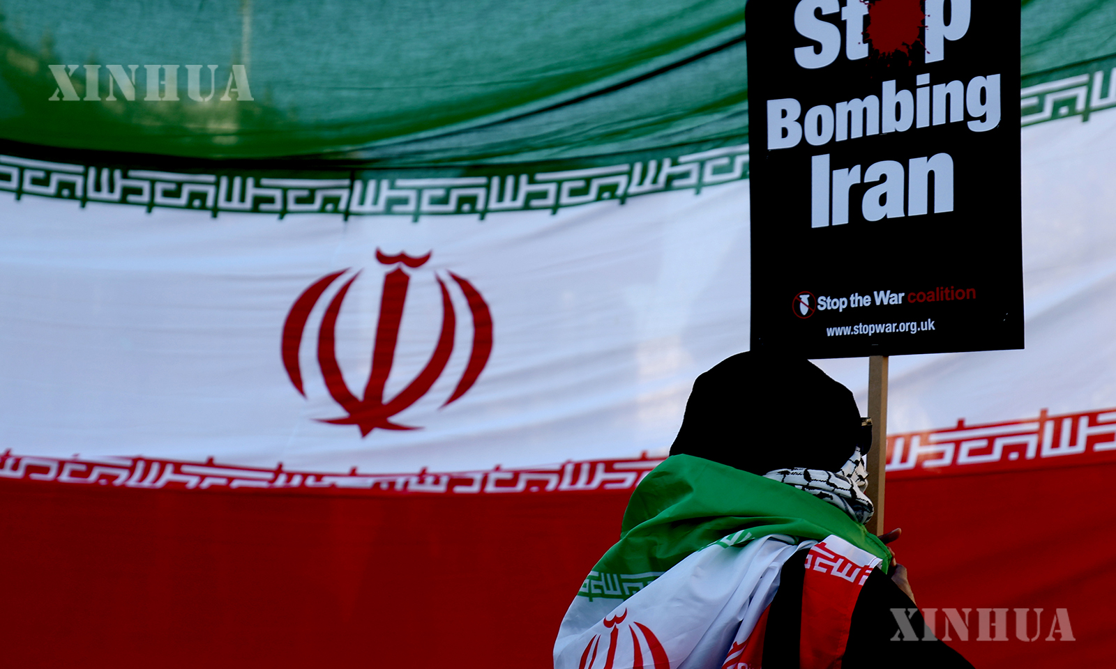 A man attends a protest against U.S.-Israeli attacks on Iran in central London, Britain, March 21, 2026. (Xinhua/Li Ying)