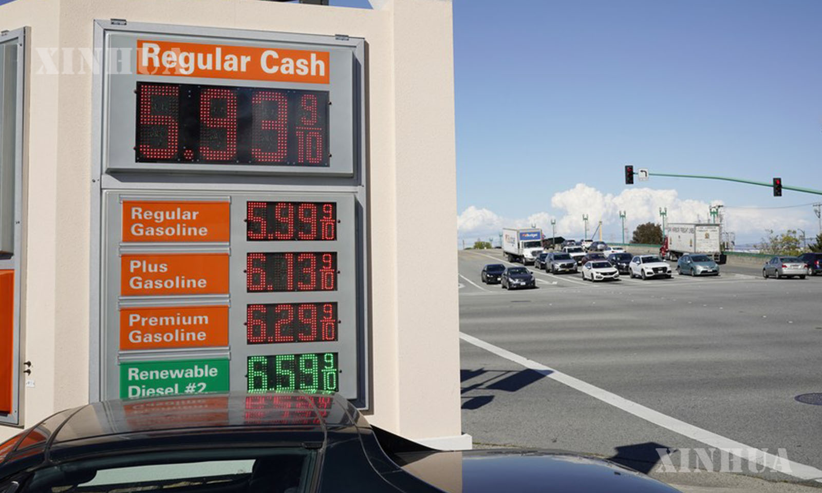 အမေရိကန်နိုင်ငံ ကယ်လီဖိုးနီးယားပြည်နယ် မေးလ်ဘရေးမြို့ရှိ စက်သုံးဆီအရောင်းဆိုင်တစ်ဆိုင်တွင် ဖန်သားပြင်ပေါ်၌ ပြသထားသည့် ဓာတ်ဆီနှင့် ဒီဇယ်ဈေးနှုန်းများကို ၂၀၂၂ ခုနှစ် မေ ၆ ရက်က တွေ့ရစဉ် (ဆင်ဟွာ)