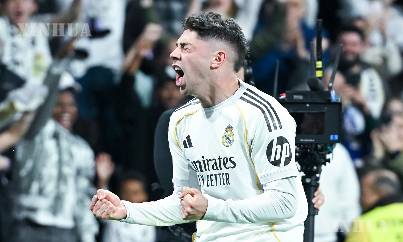 စပိန်နိုင်ငံ မက်ဒရစ်မြို့တွင် ၂၀၂၆ ခုနှစ် မတ် ၂၂ ရက်က ရီးရဲလ်မက်ဒရစ်အသင်းနှင့် အက်သလက်တီကို မက်ဒရစ်အသင်းတို့ ယှဉ်ပြိုင်ကစားသည့် လာလီဂါဘောလုံးပွဲစဉ်၌ ရီးရဲလ်မက်ဒရစ်အသင်းမှ ဖက်ဒရီကို ဗယ်လ်ဗာဒီ ဂိုးသွင်းပြီးနောက် အောင်ပွဲခံနေစဉ် (ဆင်ဟွာ)