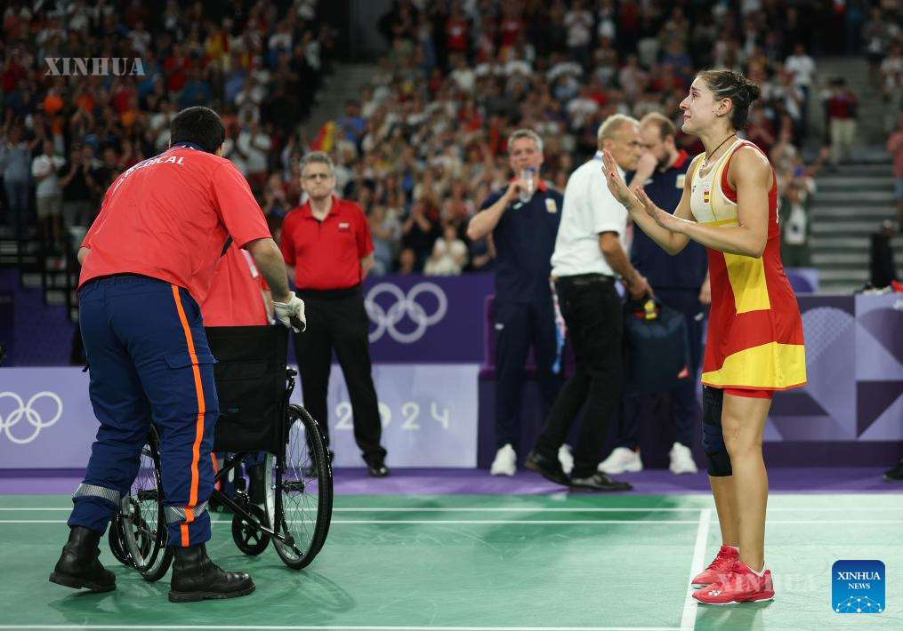 Carolina Marin (1st R) of Spain greets the audience after retiring from the badminton women’s singles semifinal match between He Bingjiao of China and Carolina Marin of Spain at the Paris 2024 Olympic Games in Paris, France, on Aug. 4, 2024. (Xinhua/Jia Haocheng)