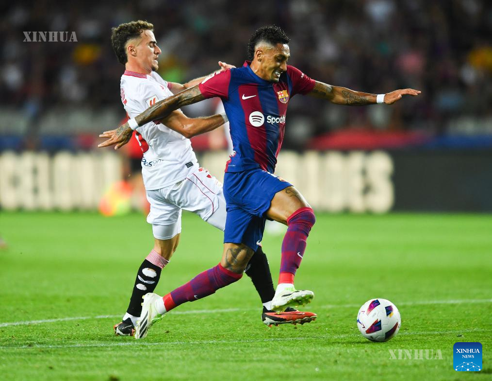 Raphinha (R) of FC Barcelona breaks through during a La Liga football match between FC Barcelona and Sevilla FC in Barcelona, Spain, Sept. 29, 2023. (Photo by Joan Gosa/Xinhua)