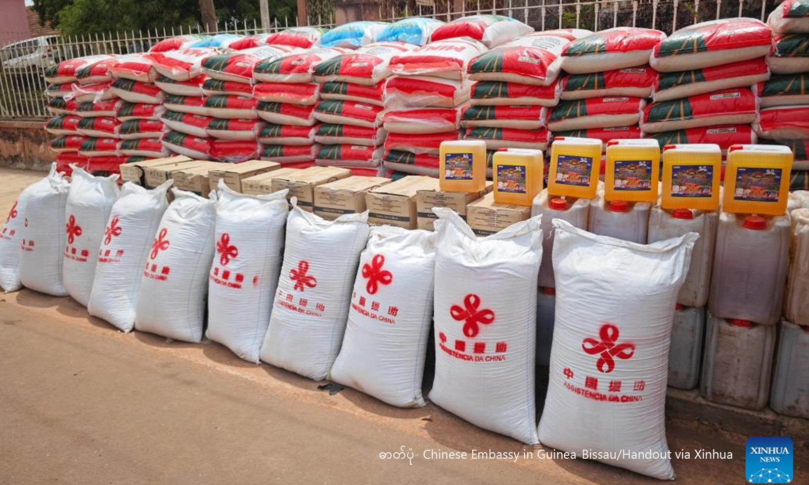 ဂီနီ-ဘစ်ဆောနိုင်ငံ ဘာဖာတာဒေသ၌ မီးဘေးသင့် ဒေသခံများအတွက် လူသားချင်းစာနာမှု အကူအညီများ ပေးအပ်လှူဒါန်းသည့် အခမ်းအနား၌ ဂီနီ-ဘစ်ဆောနိုင်ငံဆိုင်ရာ တရုတ်သံရုံးက လှူဒါန်းသည့် အထောက်အပံ့ပစ္စည်းများအား ၂၀၂၆ ခုနှစ် မတ် ၂၆ ရက်က တွေ့ရစဉ် (ဓာတ်ပုံ- Chinese Embassy in Guinea-Bissau/Handout via Xinhua)