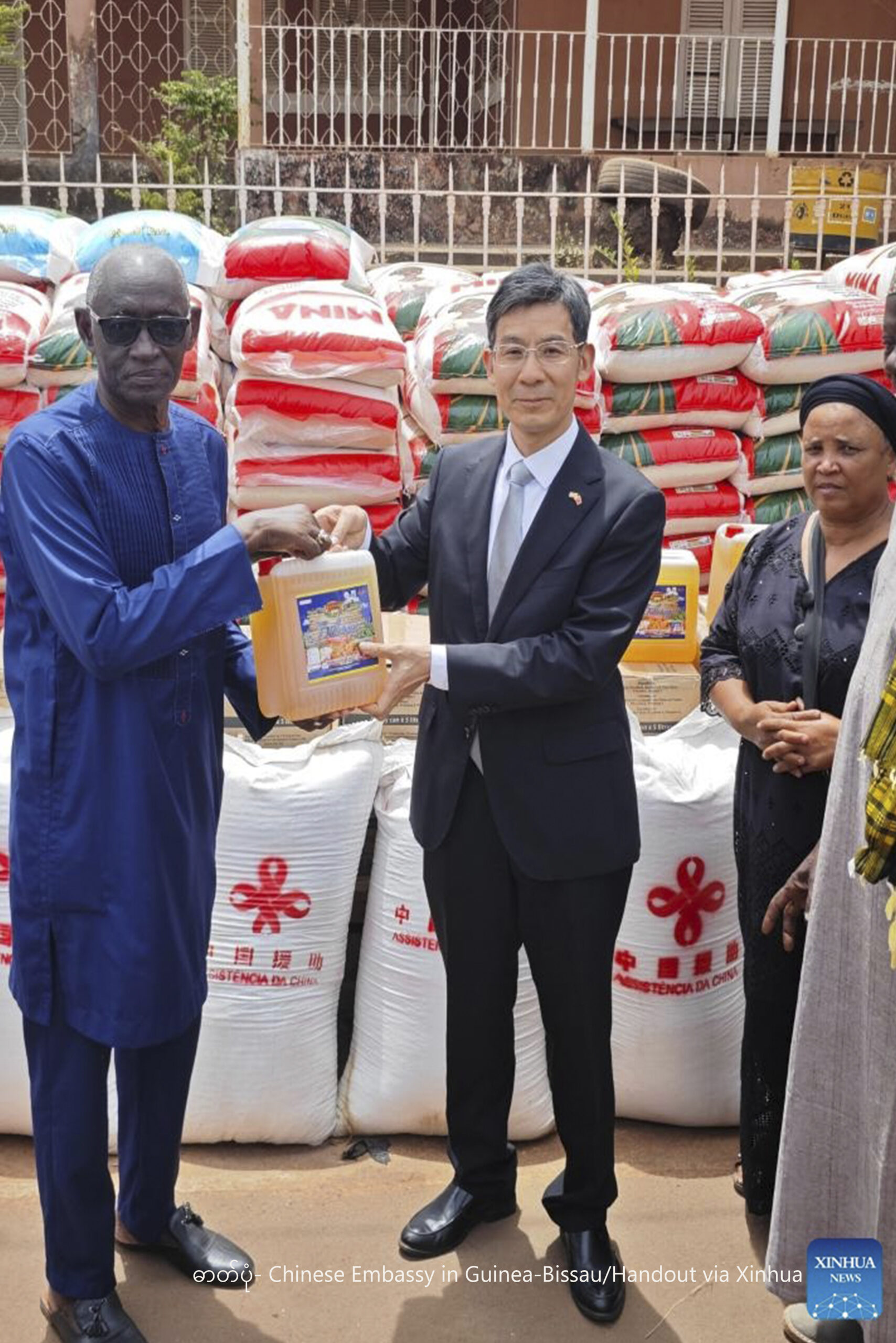 ဂီနီ-ဘစ်ဆောနိုင်ငံ ဘာဖာတာဒေသ၌ မီးဘေးသင့် ဒေသခံများအတွက် လူသားချင်းစာနာမှု အကူအညီများ ပေးအပ်လှူဒါန်းသည့် အခမ်းအနား၌ ဂီနီ-ဘစ်ဆောနိုင်ငံဆိုင်ရာ တရုတ်သံအမတ်ကြီး ယန်ရန်ဟော် (ယာ-ဒုတိယ) အထောက်အပံ့ပစ္စည်းများ လွှဲပြောင်းပေးနေပုံကို ၂၀၂၆ ခုနှစ် မတ် ၂၆ ရက်က တွေ့ရစဉ် (ဓာတ်ပုံ- Chinese Embassy in Guinea-Bissau/Handout via Xinhua)