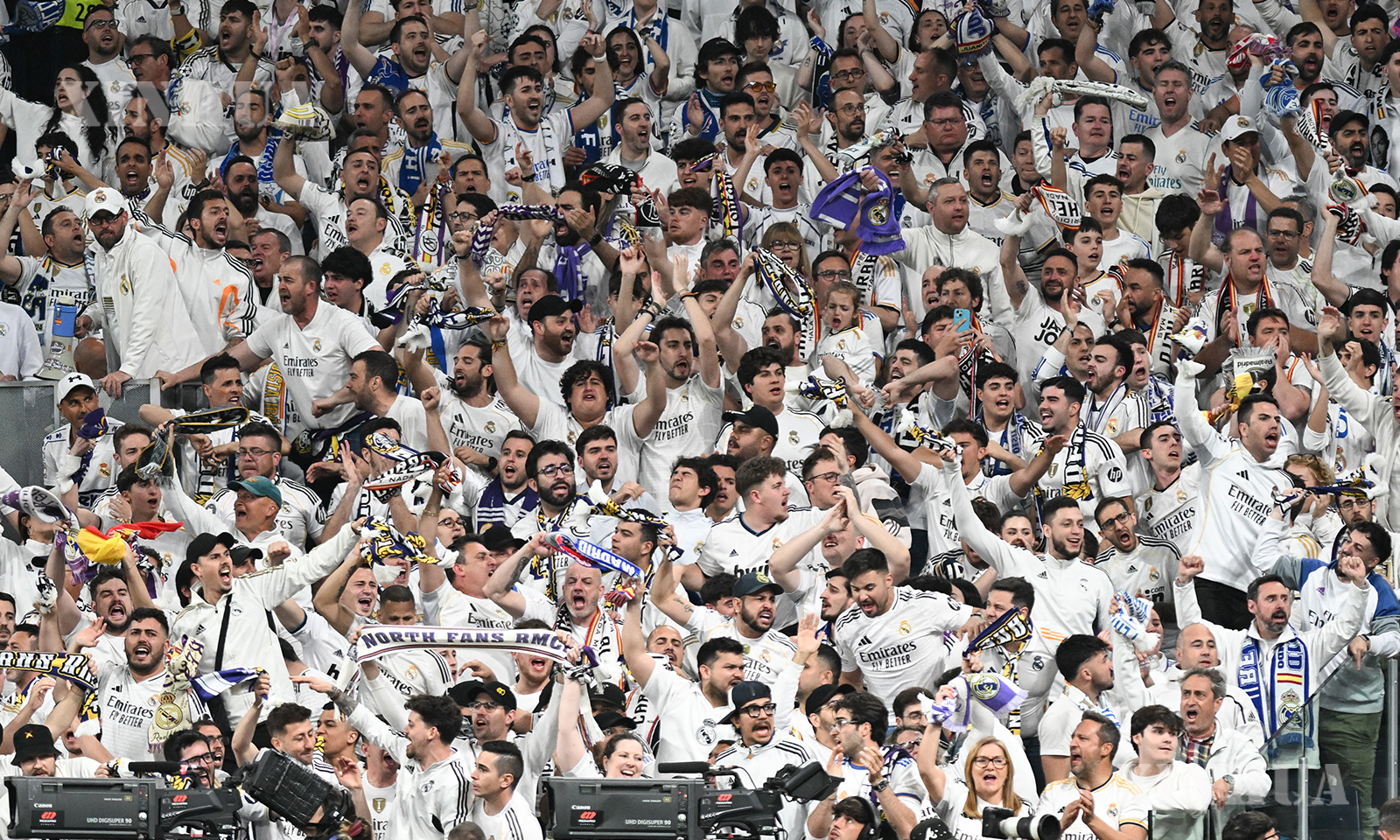 Fans of Real Madrid cheer for the team during the 2025/2026 UEFA Champions League quarterfinal first leg football match between Real Madrid and Bayern Munich in Madrid, Spain, April 7, 2026. (Xinhua/Cheng Min)