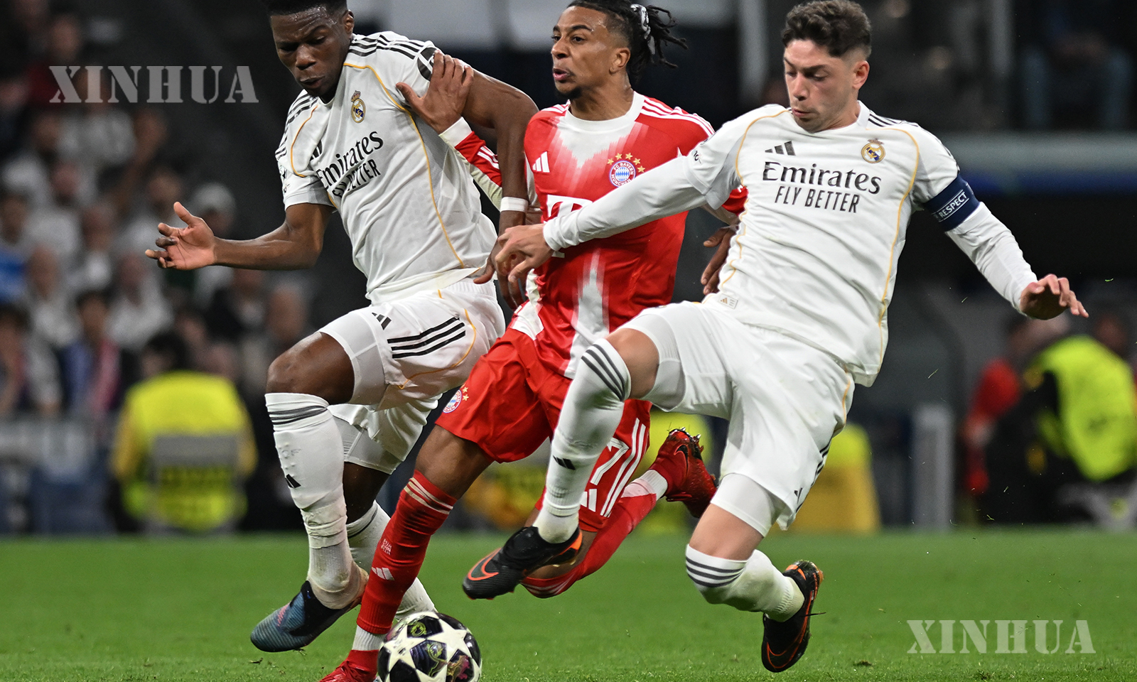 Michael Olise (C) of Bayern Munich vies with Federico Valverde (R) and Aurelien Tchouameni of Real Madrid during the 2025/2026 UEFA Champions League quarterfinal first leg football match between Real Madrid and Bayern Munich in Madrid, Spain, April 7, 2026. (Xinhua/Cheng Min)