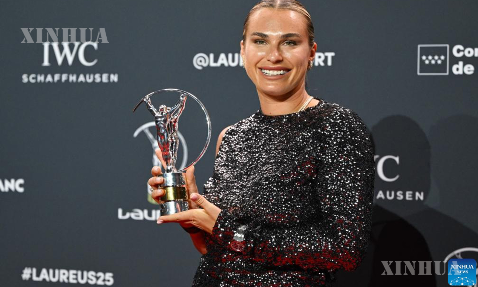 စပိန်နိုင်ငံ မက်ဒရစ်မြို့တွင် ကျင်းပသည့် ၂၀၂၆ ခုနှစ် Laureus World Sports ဆုပေးပွဲအခမ်းအနား၌ တစ်နှစ်တာအကောင်းဆုံး အမျိုးသမီးအားကစားသမားဆုနှင့်အတူ အမှတ်တရဓာတ်ပုံရိုက်နေသည့် အရီနာ ဆာဘလန်ကာအား ၂၀၂၆ ခုနှစ် ဧပြီ ၂၀ ရက်က တွေ့ရစဉ် (ဆင်ဟွာ)